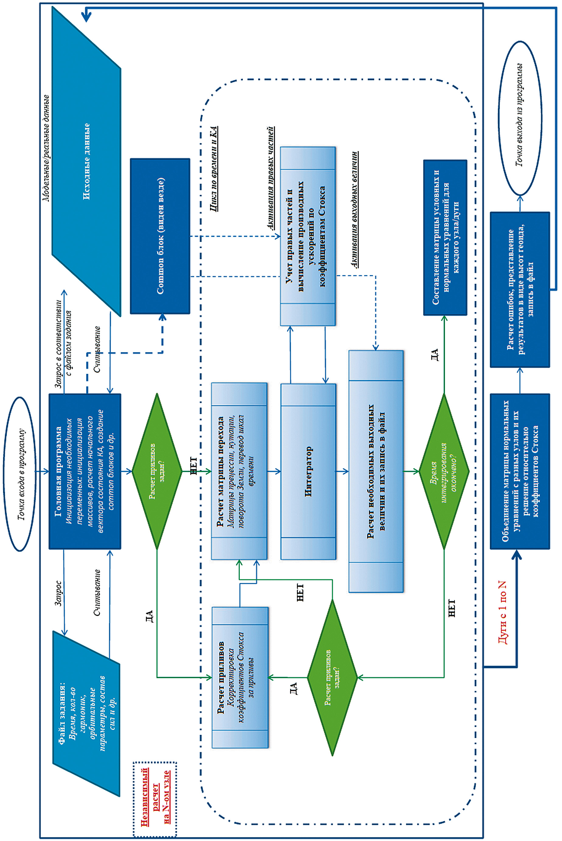 Блок-схема ПК, поясняющая его работу, представлена на рис. 1. В самом начале задаются параметры работы ПК (дата, количество восстанавливаемых гармоник ГПЗ, состав действующих сил на КА и т. д.), которые прописываются в отдельном текстовом файле. Этот файл считывается головной программой ПК, после чего идет обращение к файлам моделей, эфемерид, орбит КА (при наличии) и т. д., для выборки и записи в оперативную память ЭВМ необходимых данных для расчета. Условно эту часть ПК можно назвать модулем инициализации необходимых переменных.