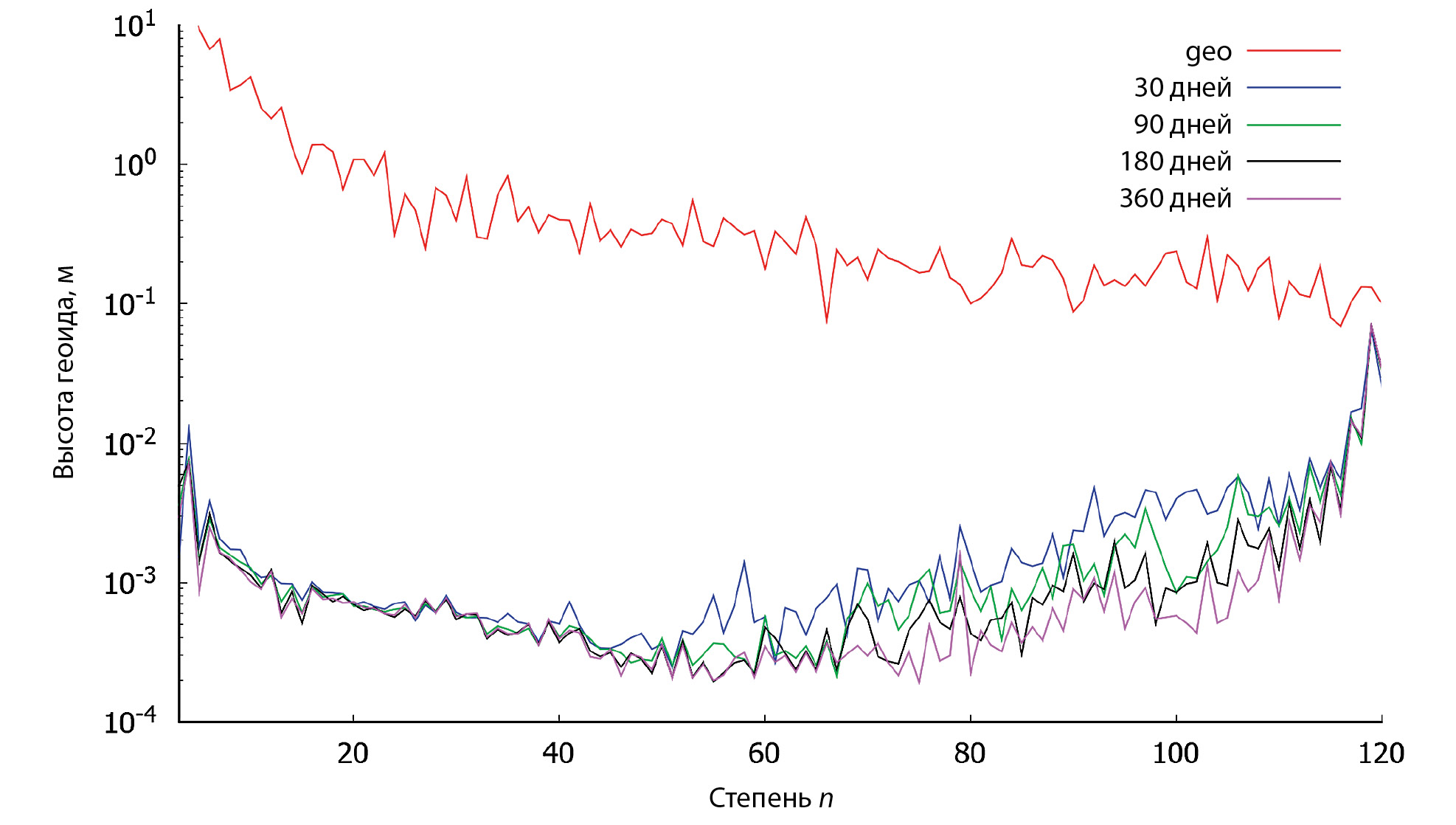 На рис. 2 представлен результат восстановления ГПЗ по данным GRACE на разных временных интервалах. В качестве эталонного поля использована модель ITSG-Grace2018s.gfc. Полученное решение на всех временных интервалах выглядит вполне достаточным, в среднечастотной части спектра (n = 40–50) разность между восстановленным и эталонным полями не превосходит долей миллиметра, в худшем случае (n ≈ 100) достигает единиц сантиметров.
