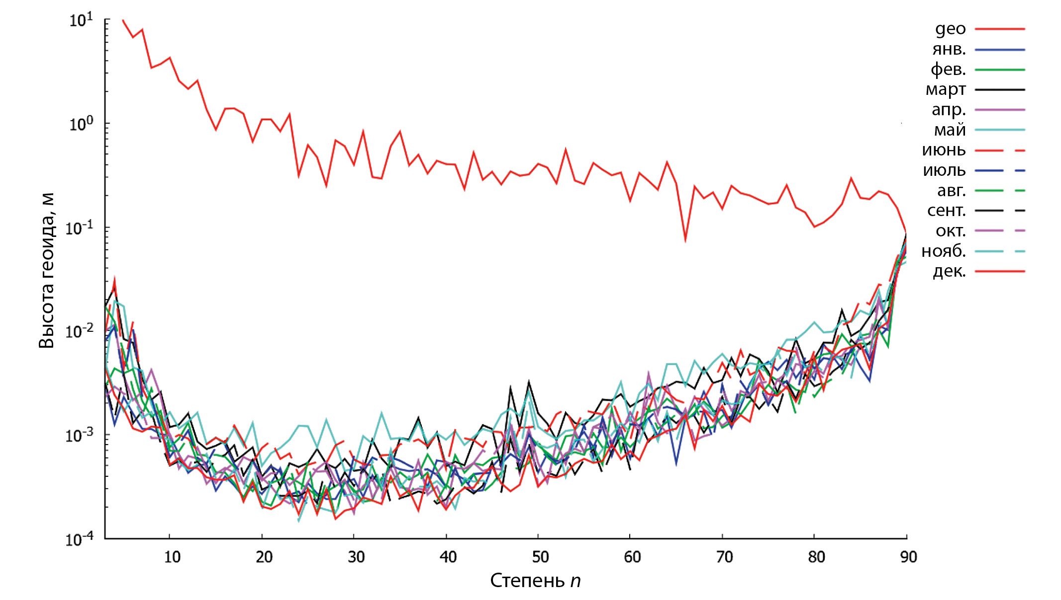 Дисперсии степенных разностей восстановленного поля и эталонных моделей демонстрируют характерное поведение ошибок коэффициентов сферических гармоник: сначала они уменьшаются, достигая минимального значения в низкочастотной и начале среднечастотной частей спектра, затем они возрастают, достигая соответствующих значений гравитационного сигнала (кривая «geo») (см., напр., [38]). Минимальных значений высот геоида (≈ 0.1 мм) эти разности достигают для степеней n = 20–60. Формально разложение имеет смысл, пока величина ошибки сферической гармоники не станет равной значению самой сферической гармоники. В данном случае это происходит при n = 160. Таким же образом меняется поведение дисперсий степенных разностей эталонных моделей в сравнении комбинированной моделью XGM2019e (кривые Grace2010s vs XGM2019e и Grace2018s vs XGM2019e). В целом изменение дисперсий степенных разностей восстановленного поля и эталонных моделей соответствует кривой Grace2010s vs XGM2019e, что говорит об адекватном восстановлении ГПЗ на длительных временных интервалах с использованием разработанного ПК.