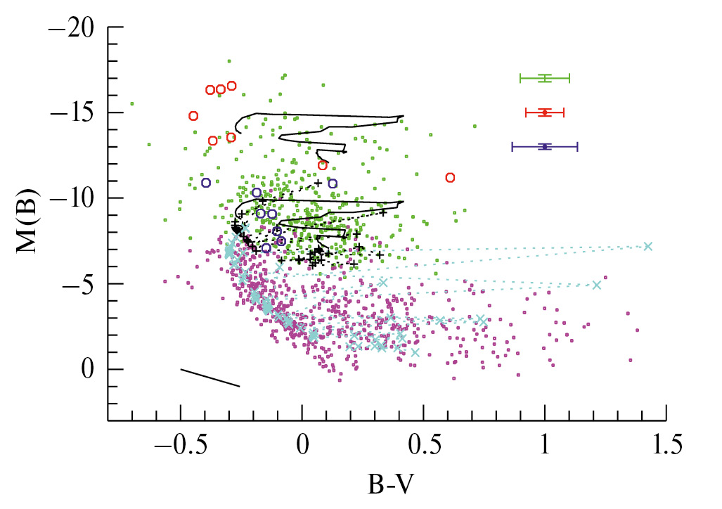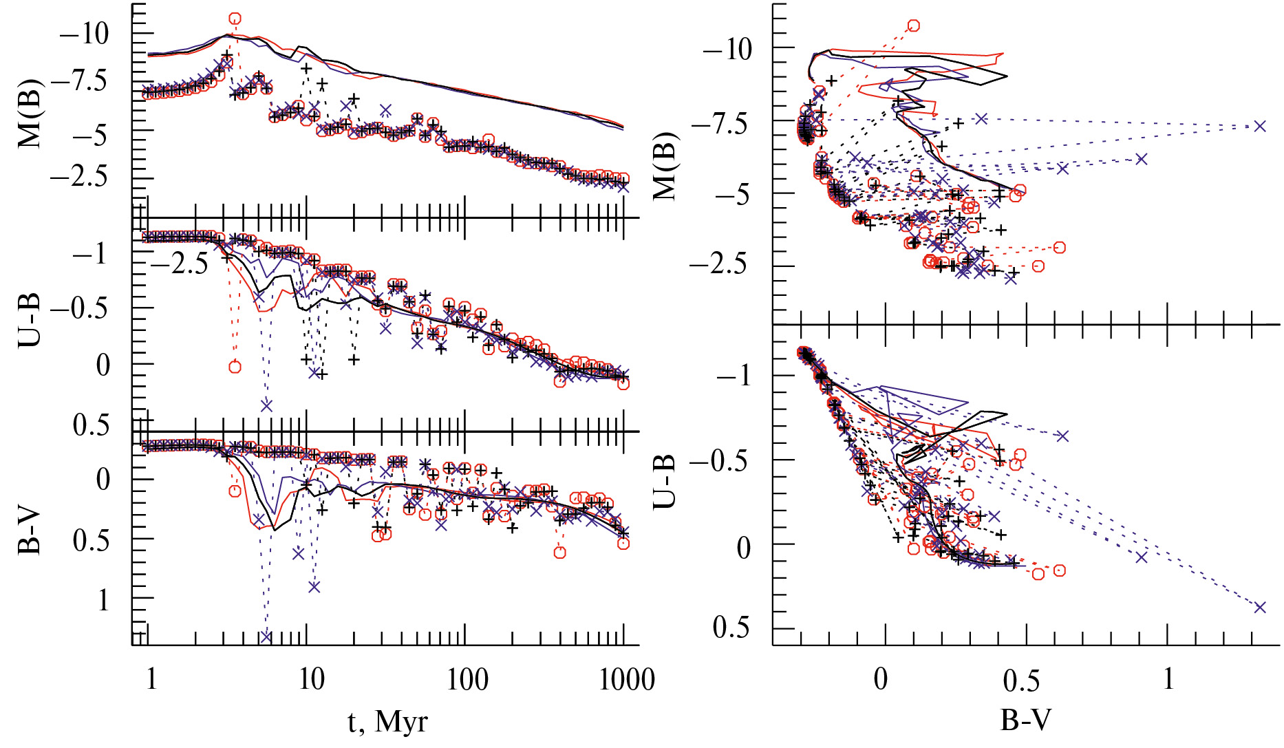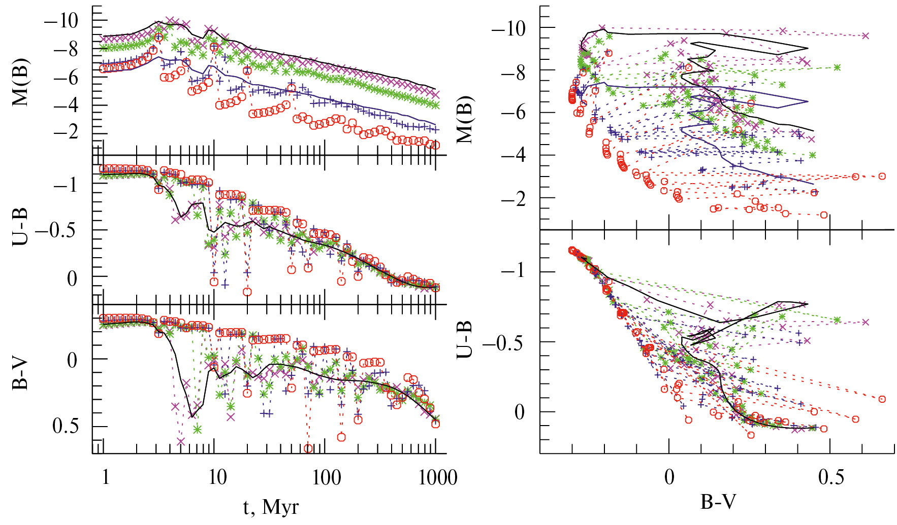 Рис. 2. Примеры эволюционных последовательностей стандартного режима моделей SSP падуанской библиотеки звездных эволюционных треков CMD версии 2.8 [41, 42, 43] (непрерывно заселенной НФМ) для звездных систем с металличностью Z = 0.012 и массами (синие кривые) и (черные кривые) и дискретного режима моделей (случайно заселенной НФМ) для звездной системы с Z = 0.012 и массами (красные кружки, соединенные пунктирными линиями), (синие крестики, соединенные пунктирными линиями), (зеленые звездочки, соединенные пунктирными линиями) и (фиолетовые косые крестики, соединенные пунктирными линиями). Диапазон возрастов варьируется от 1 млн до 1 млрд лет. Показаны изменения абсолютной величины M(B) и показателей цвета U –B и B –V в зависимости от возраста (слева), а также диаграмм «цвет-величина» и двухцветной (справа) для модельных эволюционных последовательностей. Показатели цвета стандартного режима моделей SSP от массы не зависят (синие и черные кривые накладываются на соответствующих графиках).