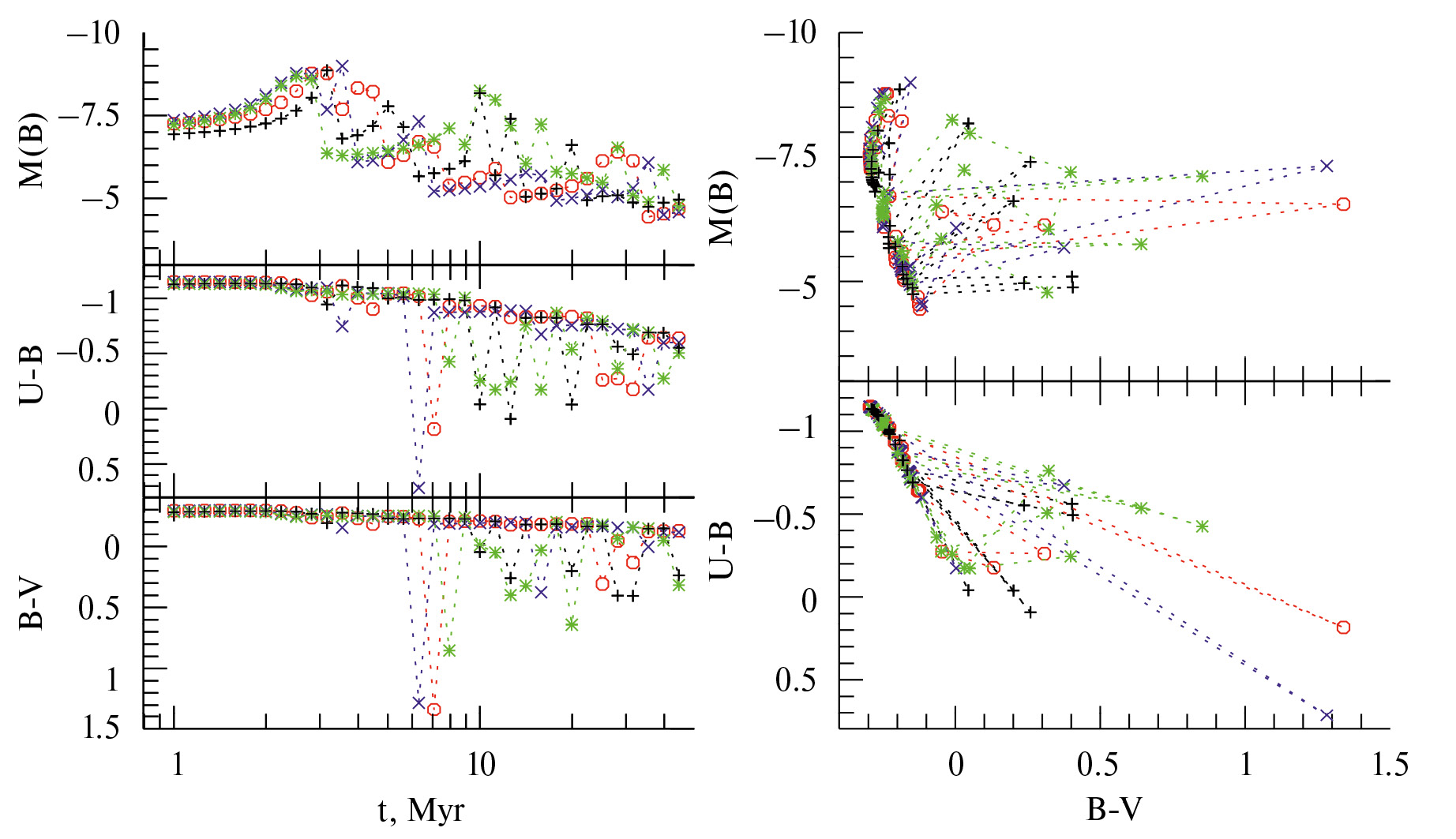 Дискретность НФМ существенно влияет на светимость и цвета скопления, что проявляется в вспышках и флуктуациях пути эволюции фотометрических параметров скопления, вызванных появлением красных гигантов. Существует также систематическое отклонение между фотометрическими параметрами (светимость и цвет) моделей простого звездного населения (моделей SSP) с дискретной и непрерывной НФМ (рис. 2). Кривые эволюции светимости дискретных моделей имеют вид наклонных колебаний и состоят из относительно коротких временных интервалов повторяющихся событий. В течение одного интервала времени происходит медленное, постепенное увеличение светимости скопления и почти мгновенная вспышка, вызванная эволюцией самой яркой звезды главной последовательности и ее возможным превращением в яркий, недолговечный красный сверхгигант. После взрыва сверхгиганта процесс повторяется с эволюцией следующей по яркости звезды главной последовательности и превращением ее в красного гиганта. Заметим, что отклонения кривых эволюции цвета и светимости дискретной модели, описанные выше, сильнее в случае малых масс скоплений, когда число красных гигантов невелико, и скопления большую часть времени проводят в виде систем со звездами главной последовательности. При вспышках в маломассивных скоплениях изменение абсолютной звездной величины в B могут превышать , а цвета - , причем в рамках дискретной модели большую часть времени молодые маломассивные звездные скопления ( моложе 30 млн лет) систематически голубее на в коротковолновых показателях цвета, чем звездные системы аналогичной массы в рамках классической непрерывно заселенной НФМ (см. левые графики на рис. 2); на диаграмме «цвет-светимость» они располагаются левее эволюционных треков звездных систем с непрерывно заселенной НФМ, а на двухцветной диаграмме - левее и выше (см. правые графики на рис. 2). По мере увеличения массы скопления до кривые эволюции цвета и светимости дискретной модели сходятся к кривым стандартной непрерывной модели (рис. 2).