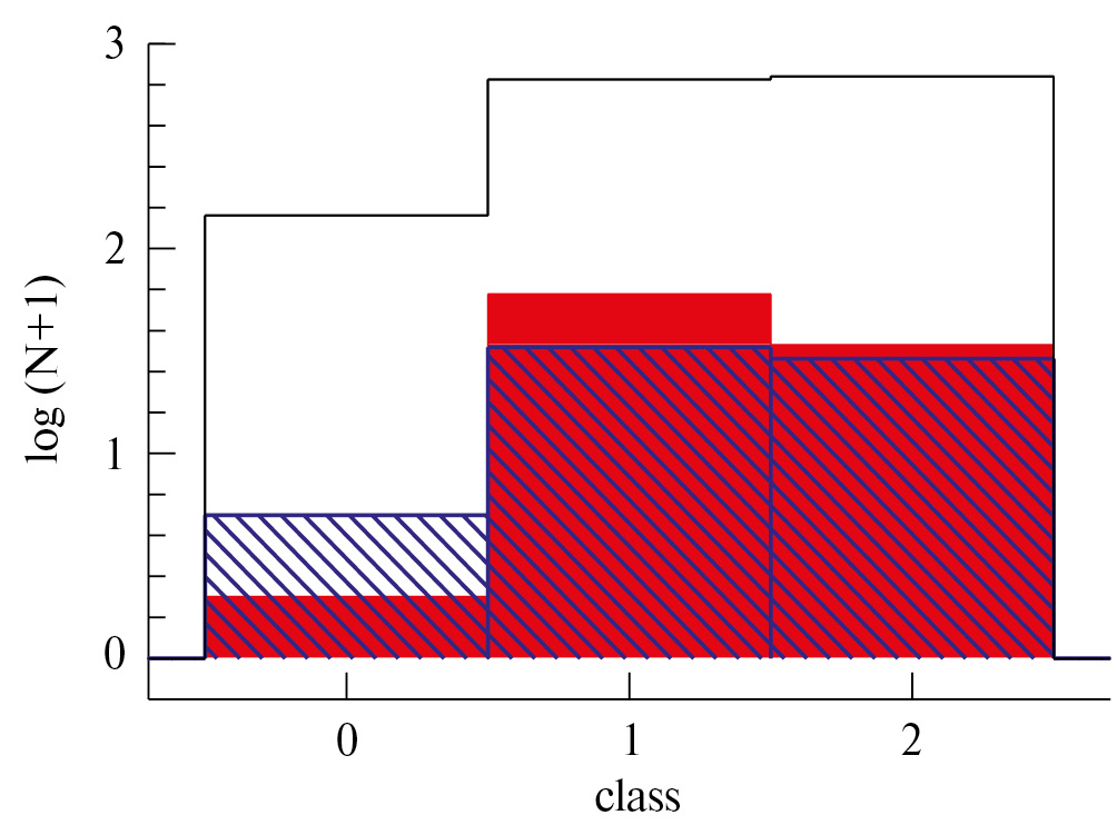 Вторым ключевым моментом в методике исследования является учет дискретности НФМ, важной для оценок физических параметров звездных группировок в ОЗО. Как было показано в работах [44, 15, 16], стохастические эффекты в дискретной, случайно заселенной НФМ начинают играть существенную роль для звездных систем с массами менее , где светимость кратковременно вспыхивающих красных гигантов становится сопоставимой с суммарной светимостью звезд главной последовательности. Основной проблемой здесь является неопределенность в количестве массивных звезд главной последовательности и их массах (см. рис. 2-4 для систем с дискретной НФМ). В частности, среди ОЗО, изученных в данной работе, эффект дискретности НФМ важен для молодых звездных скоплений в близкой галактике NGC 7292.