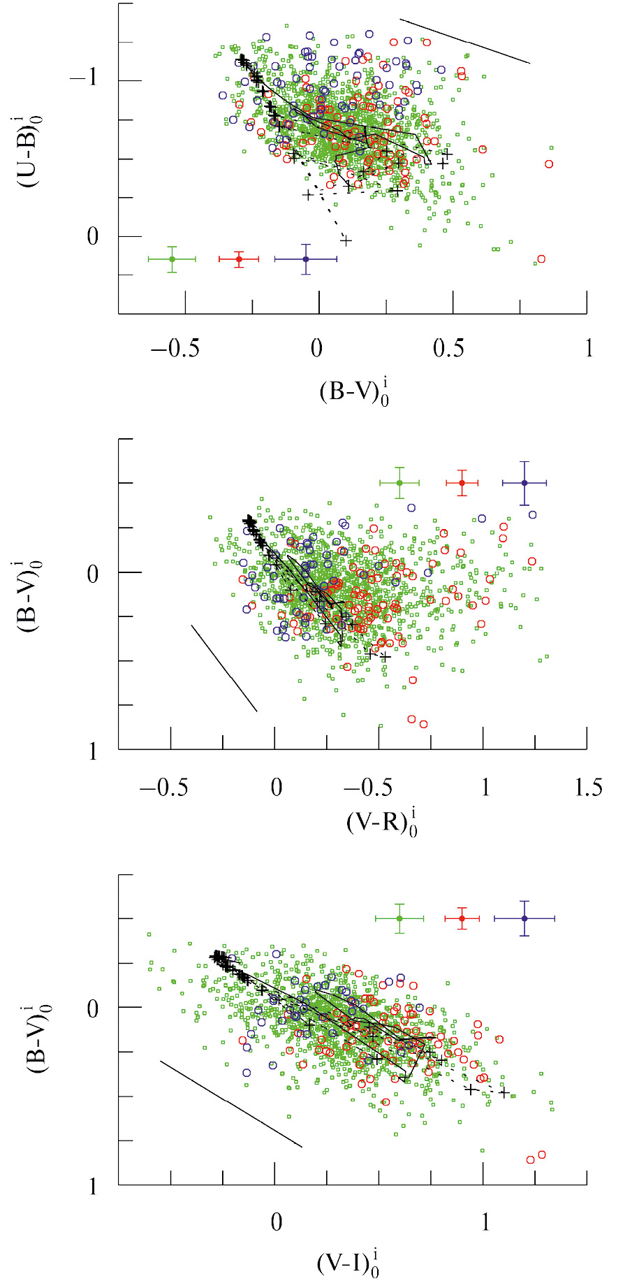 Первая из них касается корректного учета поглощения в области звездообразования. Поглощение определяется нами по бальмеровскому декременту эмиссионного излучения газа в областях H II. Использование полученного значения для учета поглощения в молодой звездной системе в полосах UBVRI возможно лишь при условии равенства звездного поглощения и поглощения в газовом облаке.