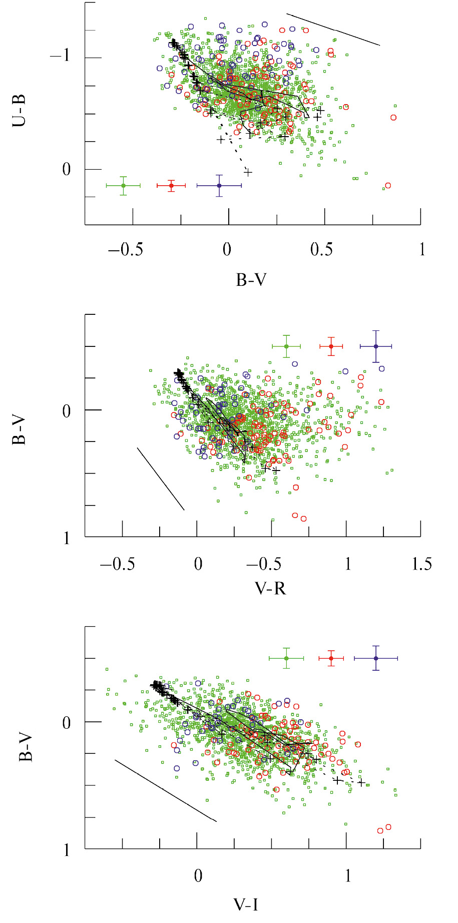 Во избежании неоднозначности зависимости «возраст-металличность» для каждого исследованного здесь объекта строилась отдельная сетка моделей единовременно образовавшегося звездного населения (SSP) для фиксированной из независимых спектроскопических наблюдений металличности [17]. Кроме того спектроскопические наблюдения использовались для вычисления величин бальмеровского декремента и оценки величины межзвездного ослабления света, излучаемого звездной группировкой, что позволило одновременно учесть неоднозначность соотношения «возраст-межзвездное поглощение», также влияющую на положение объекта на двухцветных диаграммах и, соответственно, на оценку возраста звездного населения [17]. Данные спектроскопических наблюдений позволили нам учесть влияние на широкополосную фотометрию молодых звездных популяций эмиссии окружающего их межзвездного газа [17].