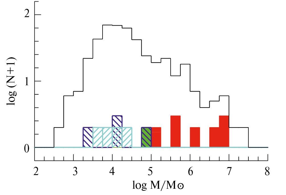 Цвета ярких массивных звездных скоплений ( ) сопоставлялись с моделями, вычисленными с помощью непрерывно населенной НФМ. В случае менее массивных звездных скоплений ( ) стохастические эффекты, связанные с дискретностью НФМ, существенно влияют на светимость и цвет скопления, усиливаясь в длинноволновой части спектра [16], поэтому цвета и светимости маломассивных звездных скоплений сопоставлялись с моделями, вычисленными с помощью случайно населенной дискретной НФМ [19].