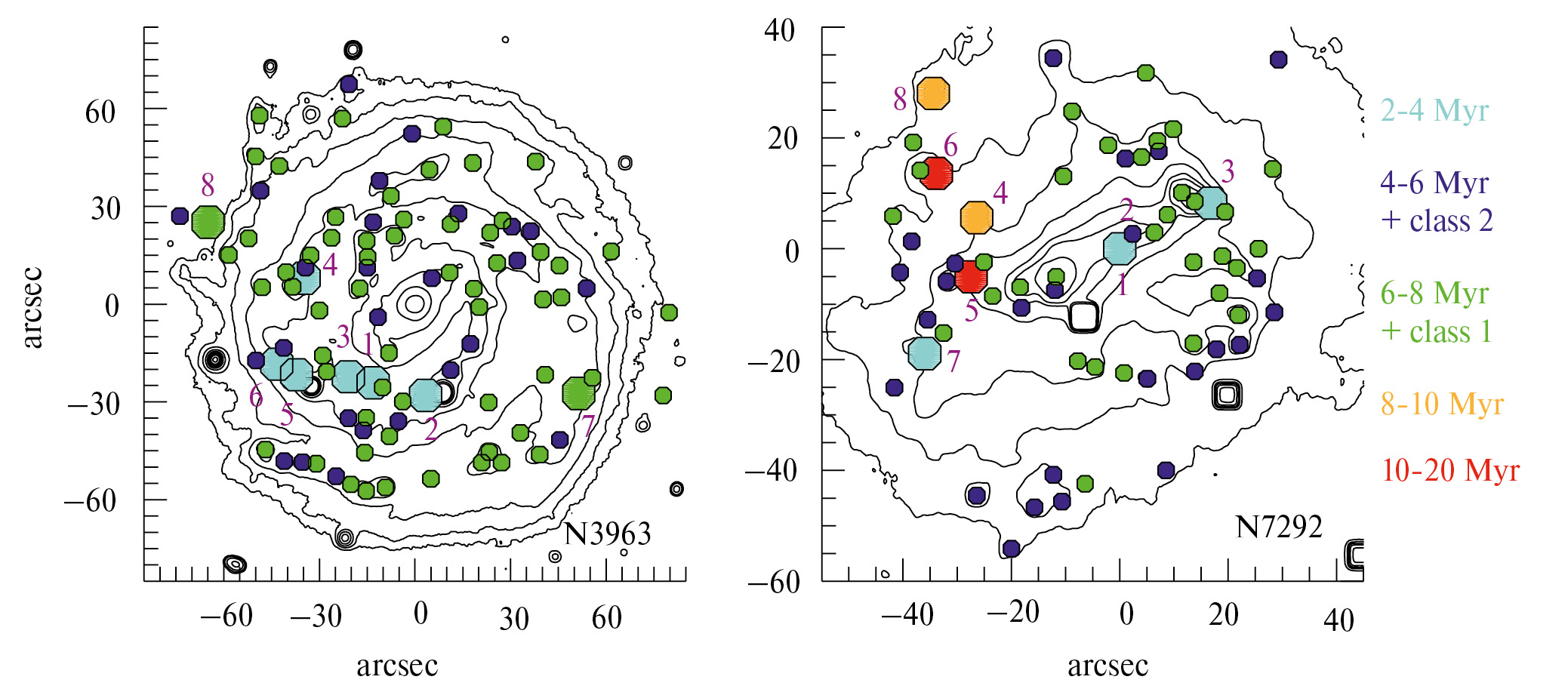 - Измеренный возраст звездного населения ОЗО лежит в диапазоне от 2.2 до 18 млн лет, причем лишь две области (обе в NGC 7292) имеют возраст старше 10 млн лет. Возраст ОЗО четко коррелирует с наличием эмиссии в линии Hα: области H II в галактиках моложе 6-8 млн лет ( млн лет), а области без эмиссии газа - старше ( млн лет).