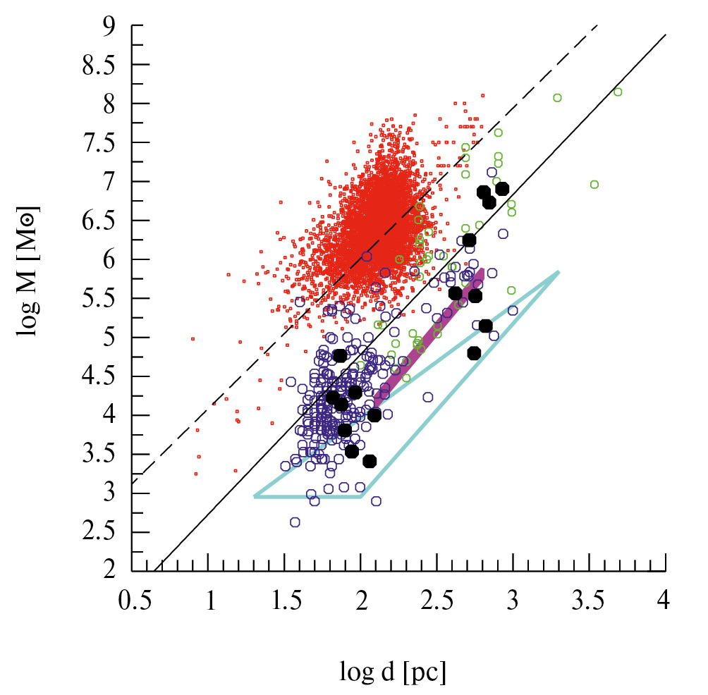 - Расположение ОЗО нашей выборки на диаграмме «масса-размер» наилучшим образом согласуется с результатами работы [59], продолжая полученную ими зависимость для комплексов в сторону менее крупных звездных ассоциаций. Отклонения от зависимости, полученной в работе [59], вызваны эффектами, связанными с линейным разрешением наших наблюдений.