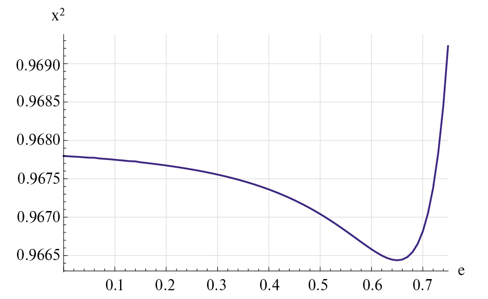 Рис. 2. Зависимость от e невязки χ2, минимизированной по всем остальным параметрам, в линейном законе потемнения к краю. Использовалась синтетическая кривая блеска с центральными значениями e = 0.1, ω = 120, точность наблюдений 10–5.