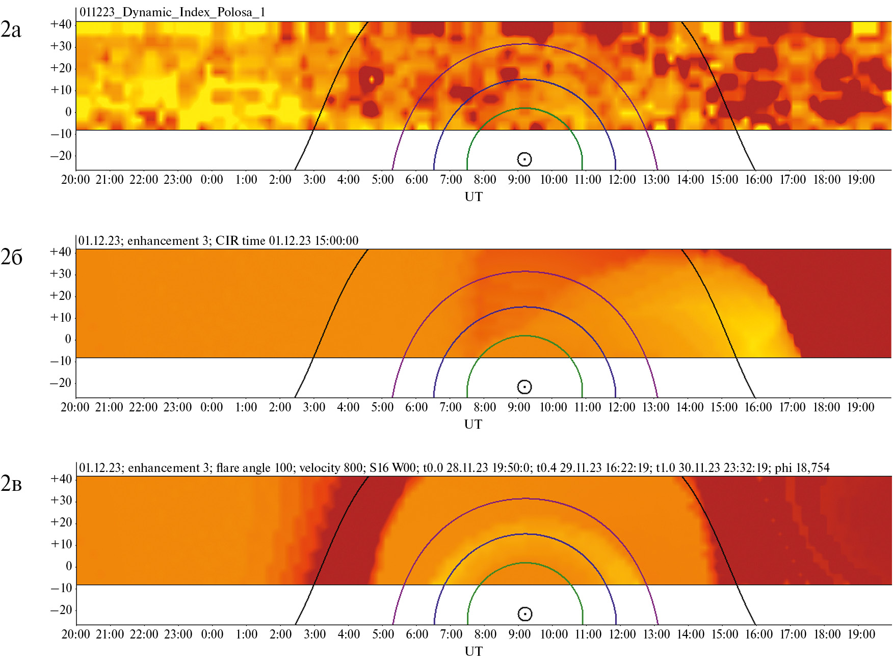 Кроме того, на рис. 1в для сравнения приведена модельная карта для коронального выброса массы (КВМ) после вспышки M9.8 28 ноября, который при скорости распространения около 800 км/с должен был прийти на Землю в момент начала возмущения магнитосферы 1 декабря в 0:00 UT. Подробнее использовавшаяся модель КВМ описана в работе [12].