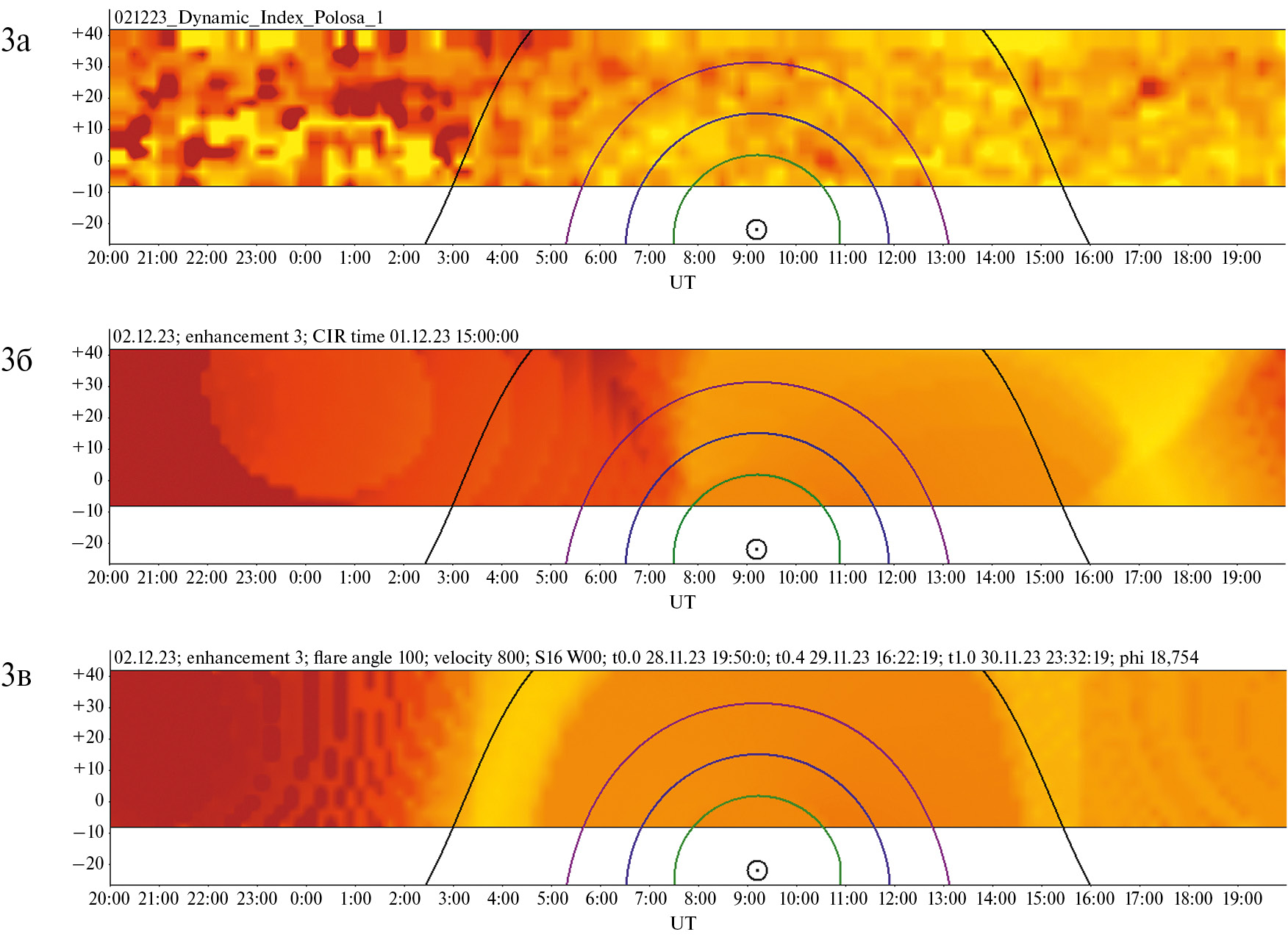 Согласно информации по Kp-индексу возмущенности магнитного поля Земли1 в период с 1 декабря 2023 г. 0:00 UT до 2 декабря 6:00 UT магнитосфера Земли была возбужденной, магнитная буря происходила в периоды 1 декабря с 9:00 UT до 15:00 UT и с 18:00 UT 1 декабря до 3:00 UT 2 декабря. Данное событие произошло после мощной и длительной солнечной вспышки M9.8 28 ноября, пик которой пришелся на 19:50 UT. Активная область была расположена вблизи центрального меридиана Солнца. Магнитная буря могла быть вызвана КВМ после указанной вспышки. Однако, данные межпланетных мерцаний по наблюдениям на БСА ФИАН указывают на то, что указанное событие, по-видимому, было вызвано КОВ. Как отмечалось выше, долгоживущие структуры типа КОВ регистрируются на Земле с периодом примерно 27 суток. Магнитная буря также была 5–6 ноября и могла быть вызвана тем же КОВ, что и рассматриваемое в настоящей статье событие. На рис. 1 приведены динамические карты индексов мерцаний за 30 ноября (день накануне начала магнитной бури): рис. 1а — карта по данным наблюдений, 1б — модельная карта для КОВ, при этом момент прохождения центральной оси через проекцию Земли на плоскость солнечного экватора (при моделировании учитывается наклон земной эклиптики по отношению к солнечному экватору) соответствует ожидаемому периоду возмущения, поскольку приходится на 1 декабря 15:00 UT.