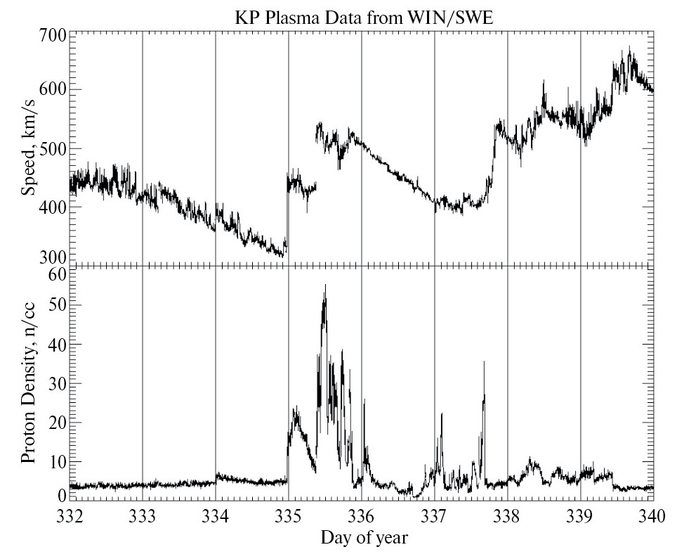 На рис. 5 показаны графики скорости солнечного ветра и концентрации протонов межпланетной плазмы по данным спутника WIN3 на интервале с 28 ноября по 5 декабря 2023 г., содержащем рассматриваемое событие 1–2 декабря 2023 г.