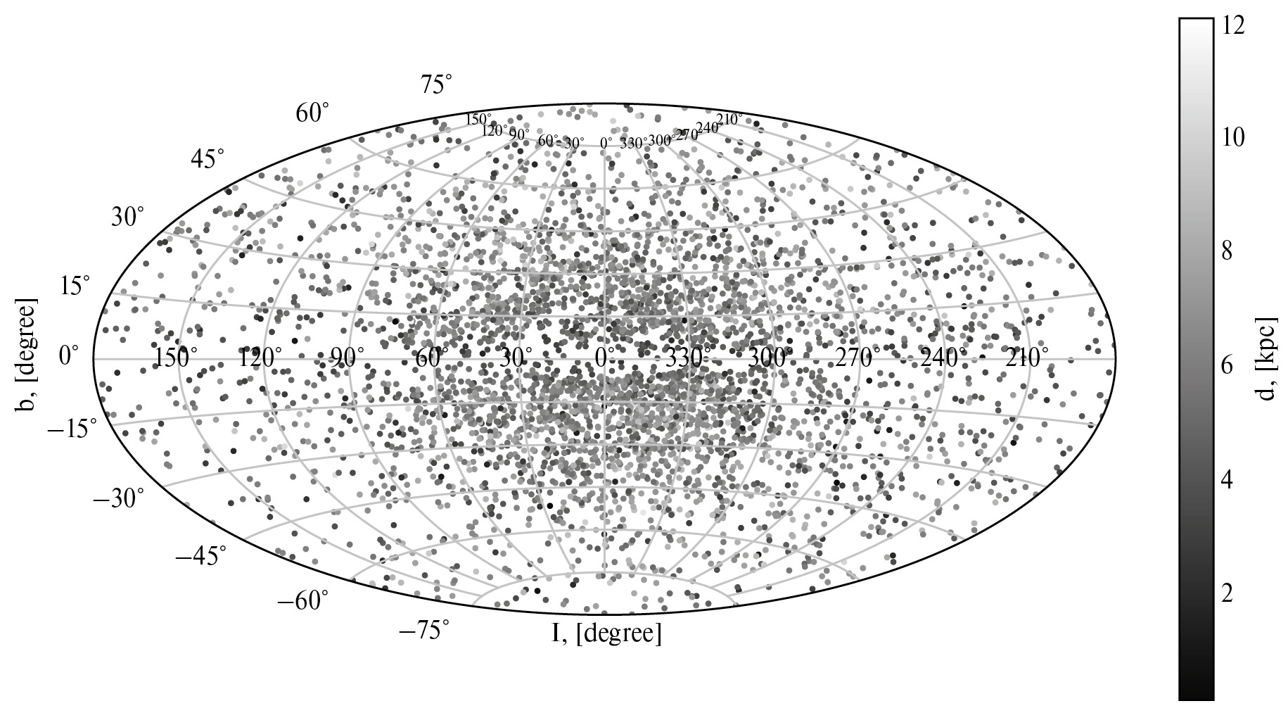 На рис. 1 показано распределение выборки звезд, отобранных по описанному выше критерию в галактических координатах (l, b). Как видно из рисунка, звезды равномерно заполняют пространство, сгущаясь к галактическому центру. При этом подавляющее большинство звезд находится в пределах 10 кпк от Солнца.