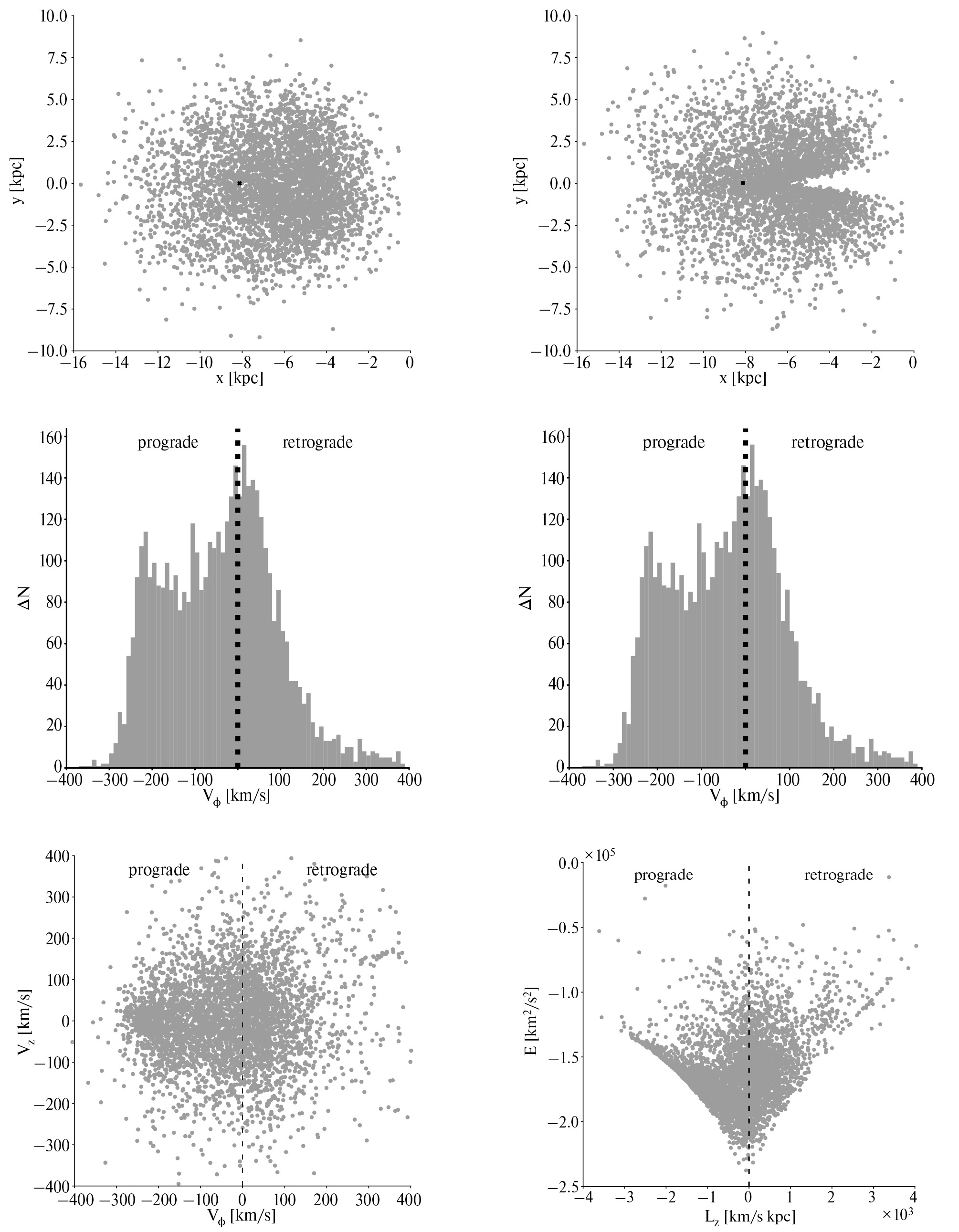 Рис. 2. Верхний ряд: распределение звезд RR Лиры в пространствах (x, y) и (x, z). Средний ряд: гистограммы распределения (d, ∆N) и (Vφ, ∆N). Внизу: распределения звезд в пространствах (Vφ, Vz) и (Lz, E). Вертикальными пунктирными линями разделены объекты, имеющие проградное и ретроградное вращение.