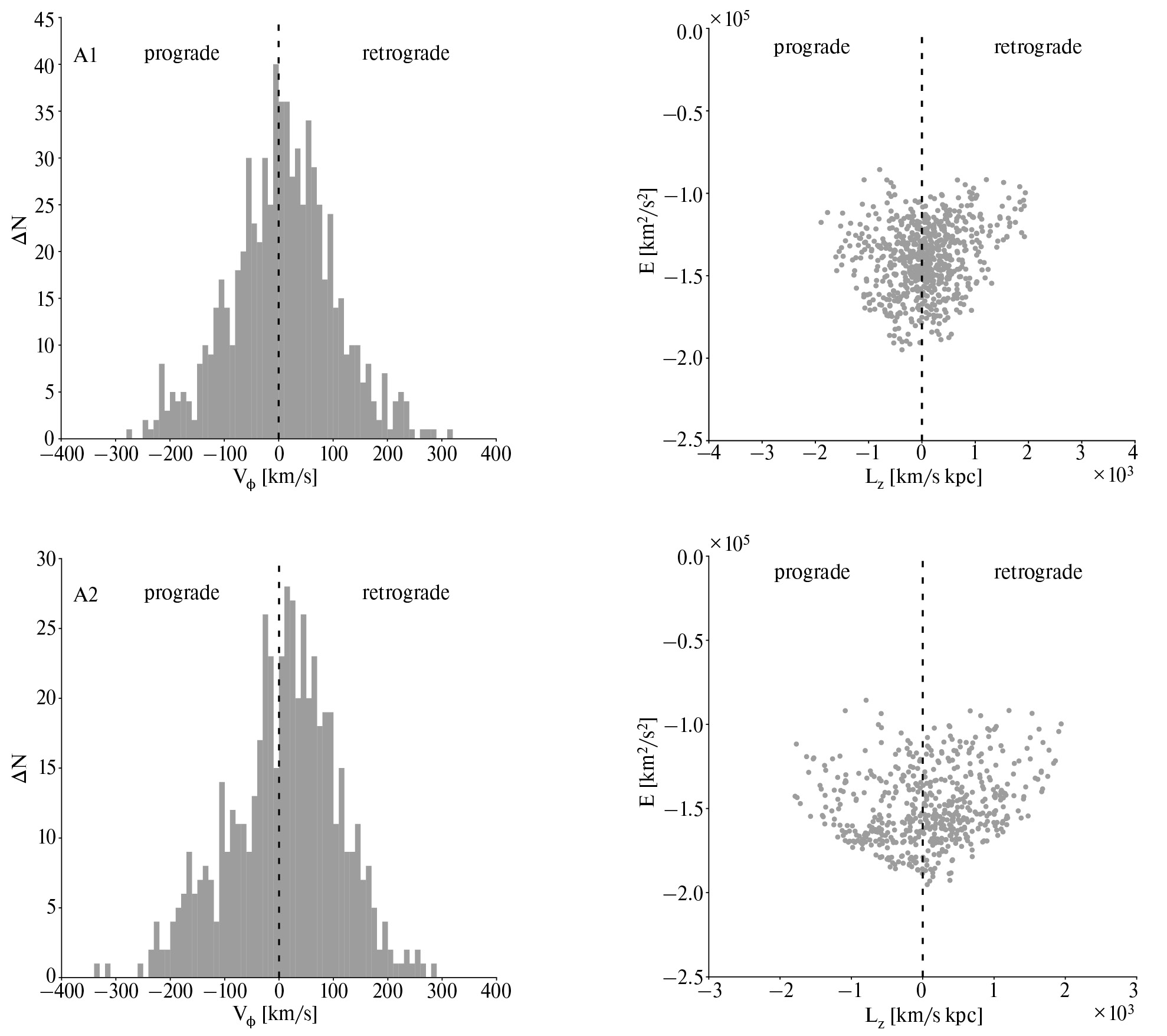 На рис. 3 представлены распределения звезд Гало в пространствах (Vf, N) и (Lz, E), отобранных по критериям А1 и А2. Выборка звезд гало, отобранная по кинематическому критерию А1, имеет слабое ретроградное вращение со средней вращательной скоростью км/с при среднем моменте импульса кпк·км/с. Из 715 звезд, отобранных по этому критерию, в направлении вращения диска движутся Npro = 326 звезд, в то время как Nret = 389 звезд имеют ретроградное вращение.
