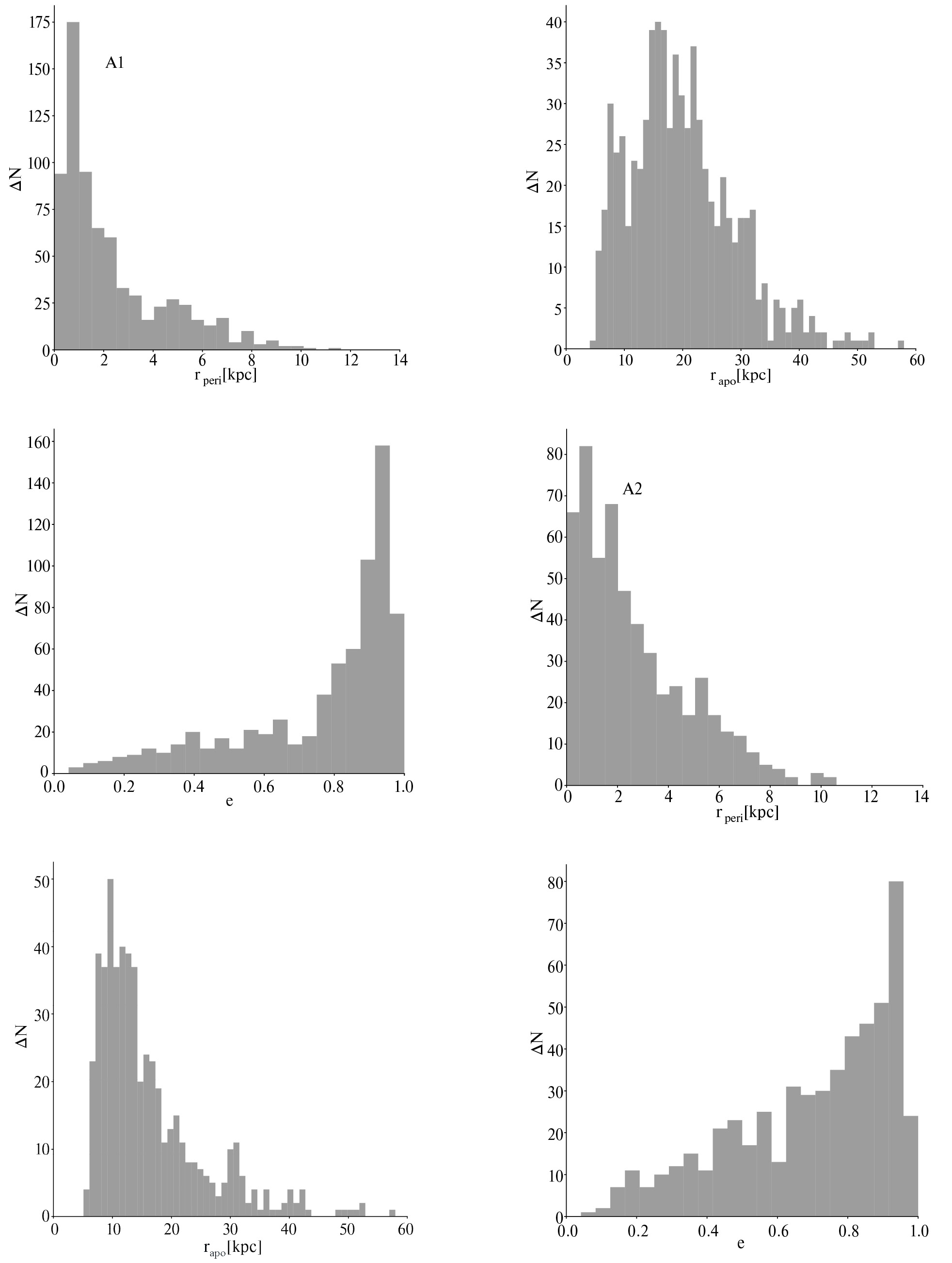 На рис. 4 показаны распределения звезд гало по перицентрам rperi, апоцентрам rapo, и эксцентриситетам e, отобранных по обоим критериям. Значения перицентров, апоцентров и эксцентриситетов звезд получены путем численного интегрирования их орбит в течение 3 млрд. лет вперед во времени в потенциале McMillan17 [21] с помощью пакета galpy [20]. Максимальный период орбит звезд выборки составляет млн. лет. Таким образом, принятого времени интегрирования достаточно для точного определения параметров орбит. Из рис. 4 видно, что подавляющее число звезд имеет сравнительно малые перицентры и вытянутые орбиты с эксцентриситетами ( ). Отметим, что значительная часть звезд выборки подходит к галактическому бару достаточно близко. Однако взаимодействие лирид гало с проградно вращающимся баром не оказывает существенного влияния на их динамику, и наблюдаемое вращение гало оказывается слабо ретроградным.