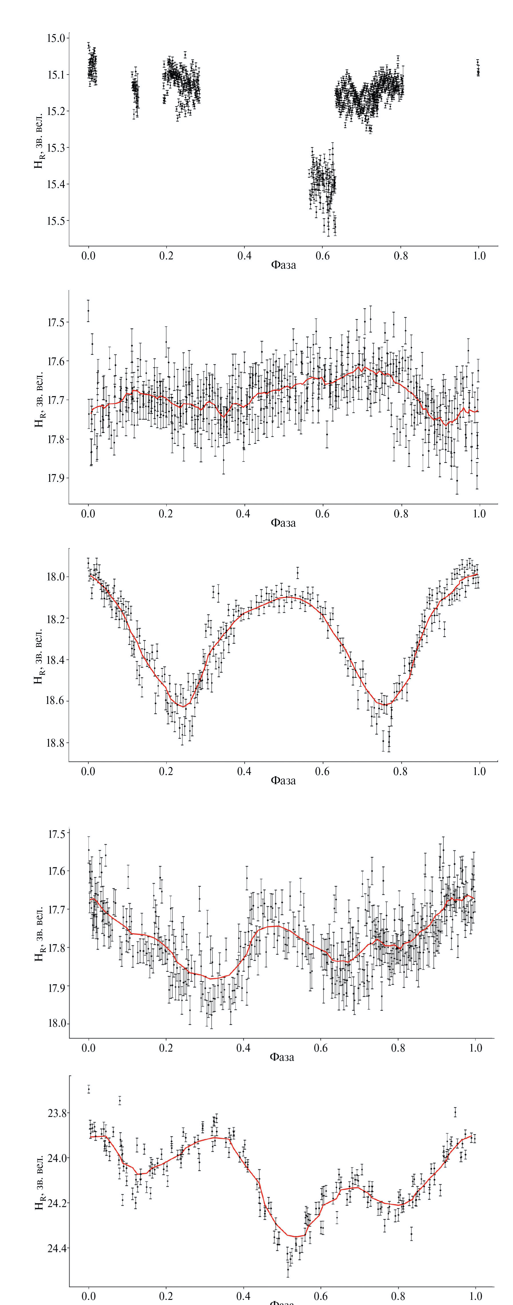 Для определения периодов вращения астероидов по фазовым кривым блеска, звездные величины в различных фильтрах были приведены к фильтру R. При построении фазовых кривых блеска для учета зависимости блеска астероида от фазового угла определялись параметры двух- или трехпараметрических моделей с использованием онлайн-калькулятора Online calculator for H, G1, G2 photometric system[2] [5–7]. Построение фазовых кривых блеска и оценка периода P осевого вращения выполнялись в онлайн-системе Period search service[3] методом Лафлера-Кинмана [8]. Примеры фазовых кривых блеска показаны на рис. 3–5. По оси ординат приведены значения HR — абсолютные звездные величины в фильтре R.