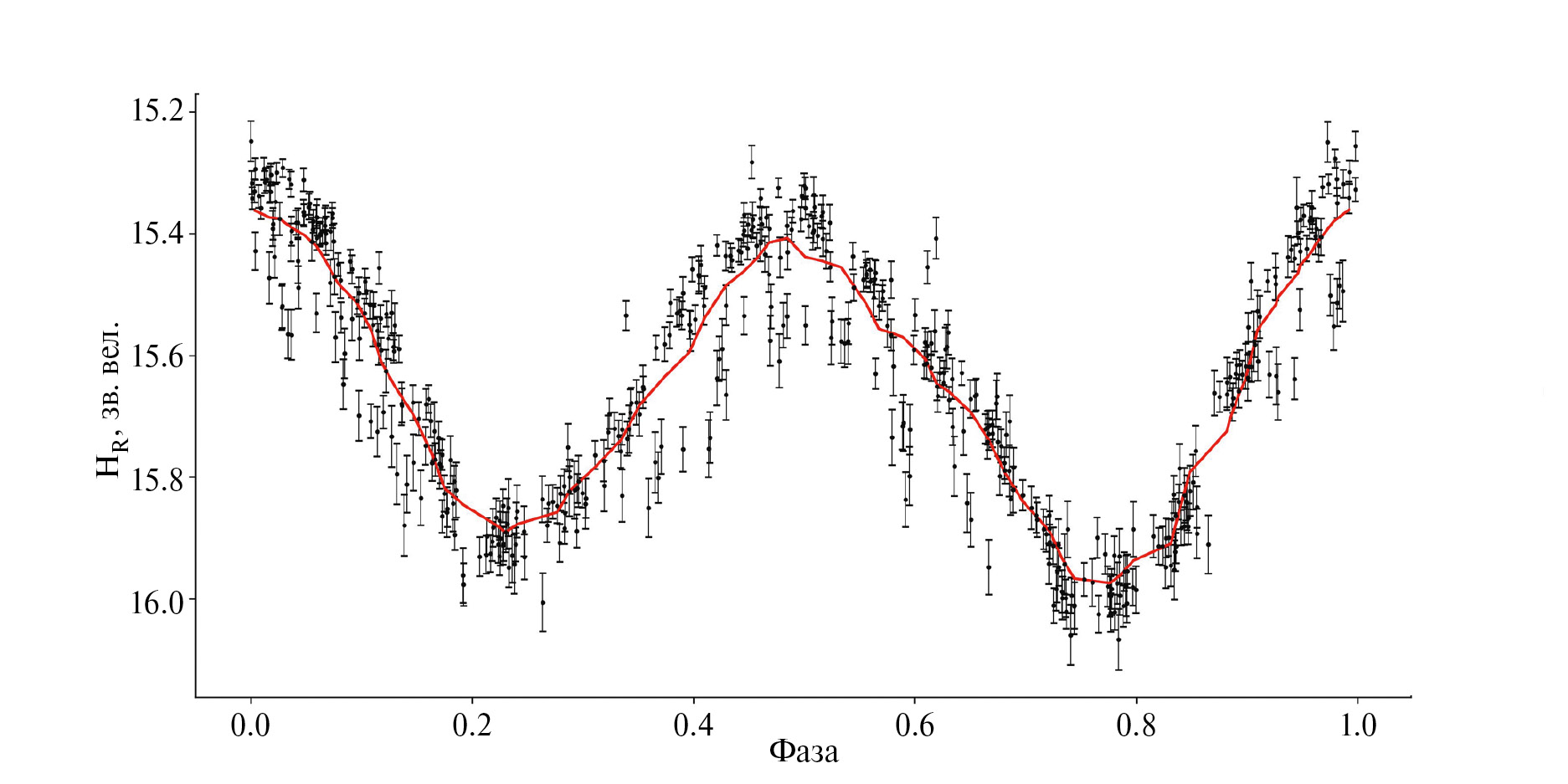 Рис. 5. Фазовая кривая блеска астероида (161 989) Cacus по наблюдениям на телескопах СБГ и Цейсс-1000. Красная линия — скользящее среднее.