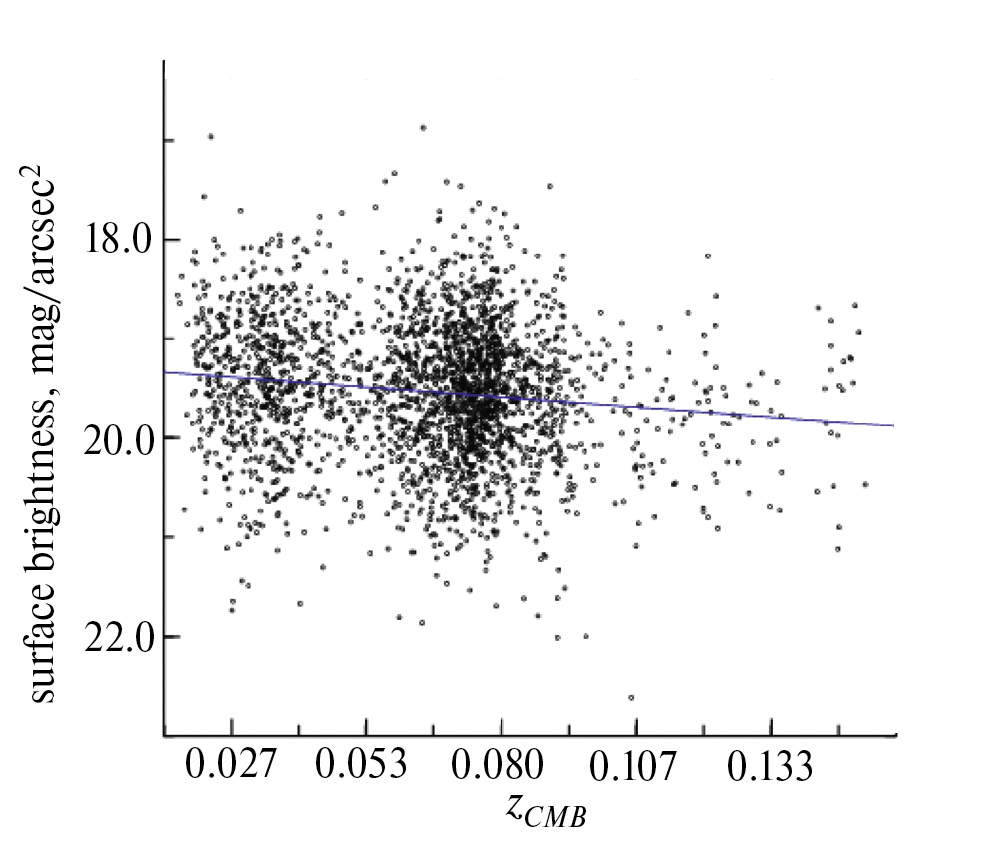 Известно, что в расширяющейся Вселенной поверхностная яркость объекта изменяется как ( z — красное смещение объекта, SB — поверхностная яркость), происходит космологическое ослабление поверхностной яркости. Множитель возникает из-за расширения пространства Вселенной, множитель — из-за релятивистских эффектов вследствие радиального собственного движения. Отсюда вытекает поправка в логарифмической форме за ослабление поверхностной яркости галактик в расширяющейся Вселенной, например [26]:
