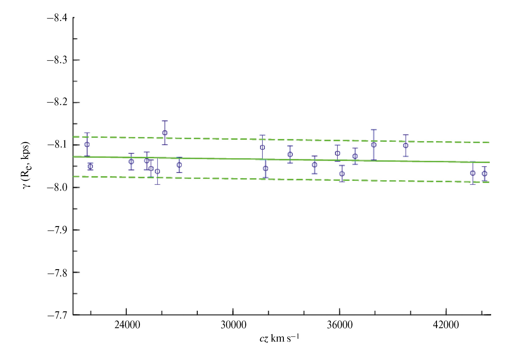 где — эффективный радиус галактики в килопарсеках, — средняя эффективная поверхностная яркость в пределах этого радиуса, — дисперсия лучевых скоростей звезд и — нуль-пункт ФП, зависящий от расстояний галактик. Значение нуль-пункта нашей выборки получено для принятой стандартной ΛCDM космологии. Стандартное отклонение нуль-пункта ФП равно 0.071, что эквивалентно — ошибке определения расстояния одной галактики.