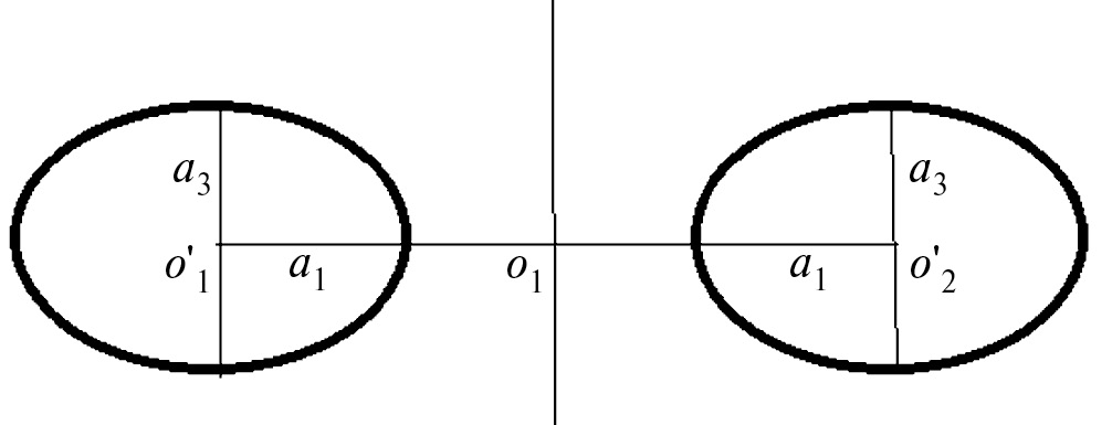 Рис. 1 Сечения фигур двойного астероида. Оба тела имеют конгруэнтную эллипсоидальную форму и одинаковые массы, и — полуоси фигуры. Астероиды обращаются вокруг точки и расстояние между центрами масс равно