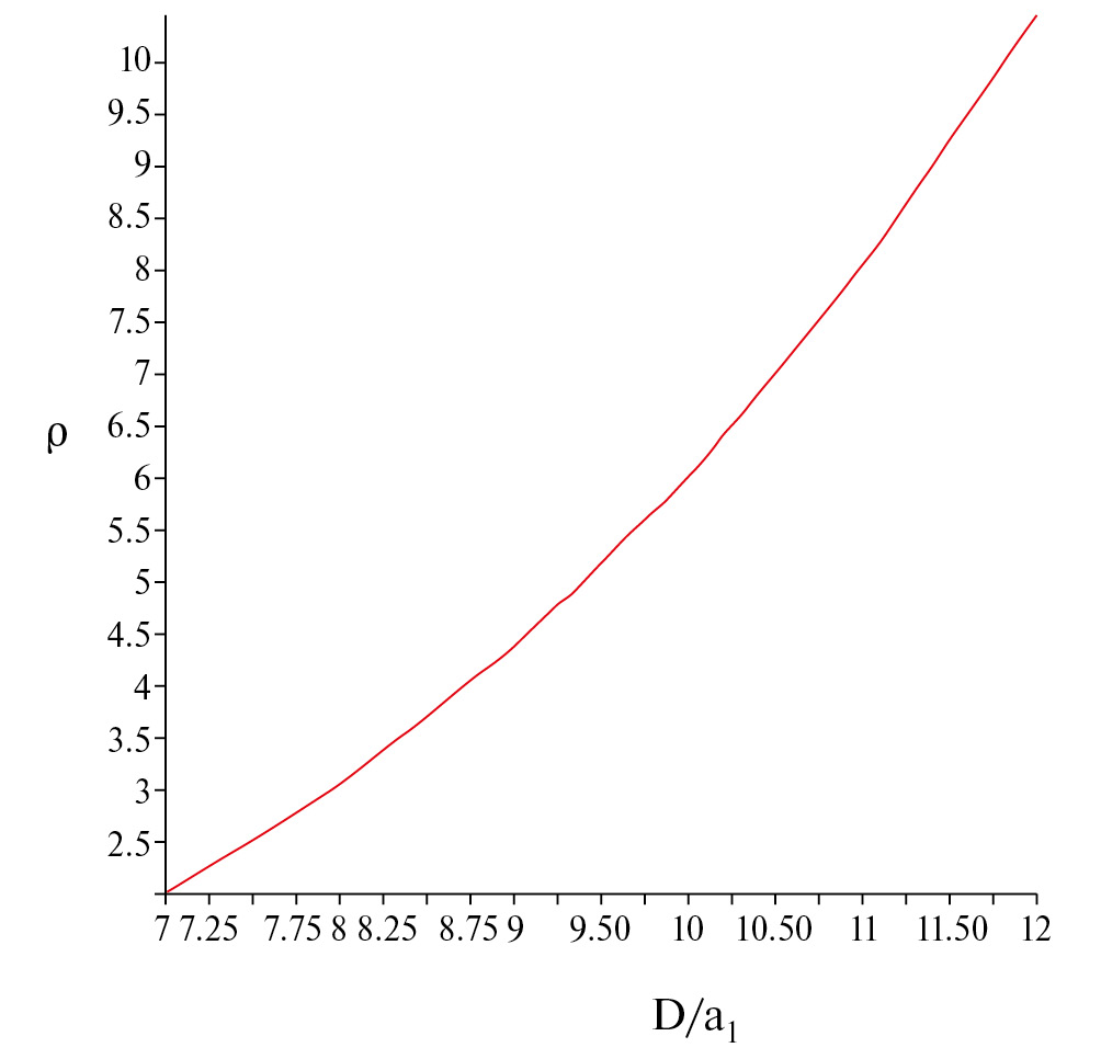 Рис. 2. Зависимость плотности вещества в двойном астероиде (190166) 2005 UP156 от нормированного расстояния между центрами масс D/a1.