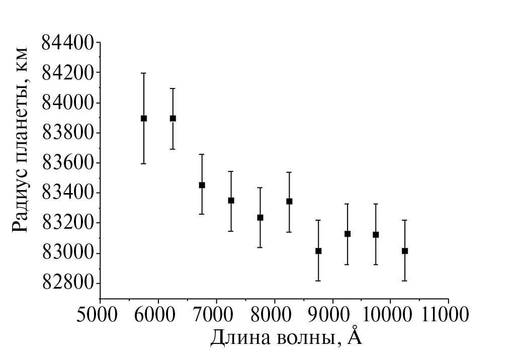 Еще одним результатом можно считать то, что в рассмотренной в данной работе модели характеристическая высота и радиус непрозрачной части планетарного диска были фиксированными для всех длин волн, в то время как коэффициент непрозрачности менялся от длины волны как , и при этом удалось получить эффективные радиусы планеты, а также их зависимость от длины волны, близкие к тем, что были получены из интерпретации наблюдательных данных (см. рис. 7–9). Это можно рассматривать как свидетельство возможности применения приблизительной модели рэлеевской атмосферы при определении характеристик атмосфер экзопланет из многоцветных фотометрических наблюдений.