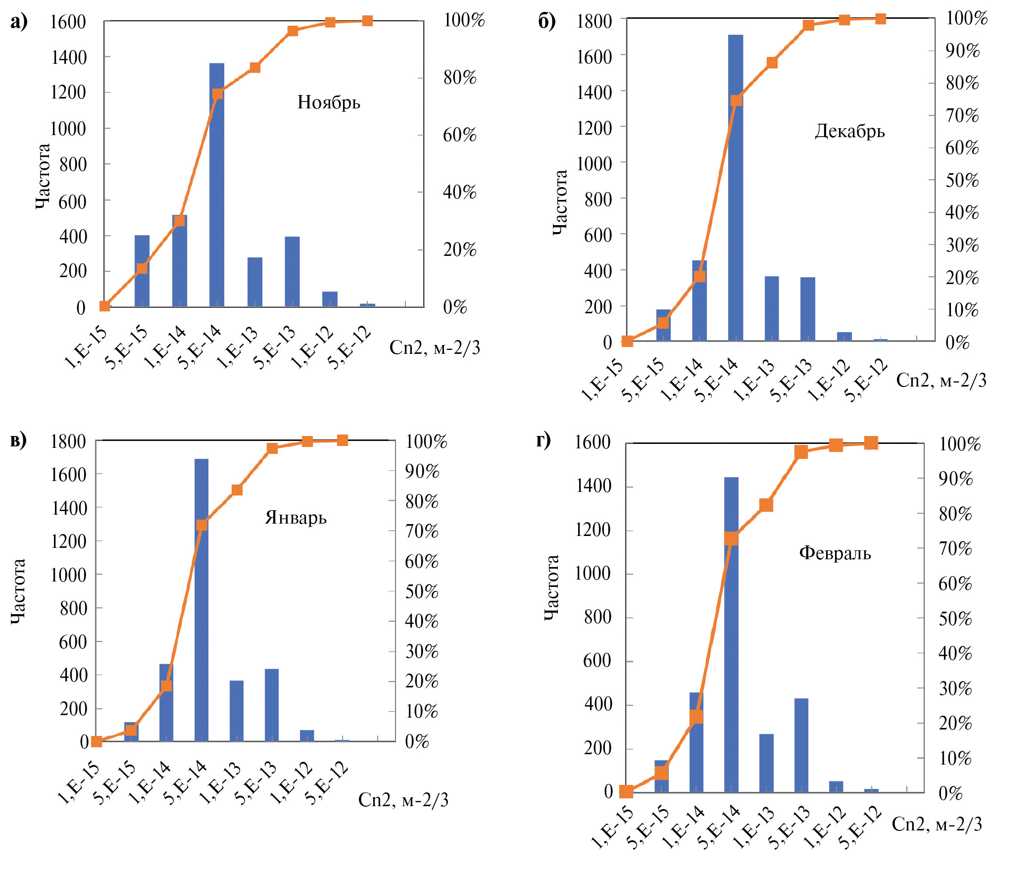 Структурная постоянная показателя преломления часто используется как мера величины турбулентности атмосферы. Следует отметить, что оптическая турбулентность приземного слоя обычно больше, чем ее высотное значение. На рис. 6 представлены гистограммы распределения значений структурной постоянной показателя преломления для каждого месяца отдельно, измеренные в режиме 24/7 ультразвуковой станцией «МЕТЕО-2» с частотой 10 Гц и усреднением на интервале 10 минут.