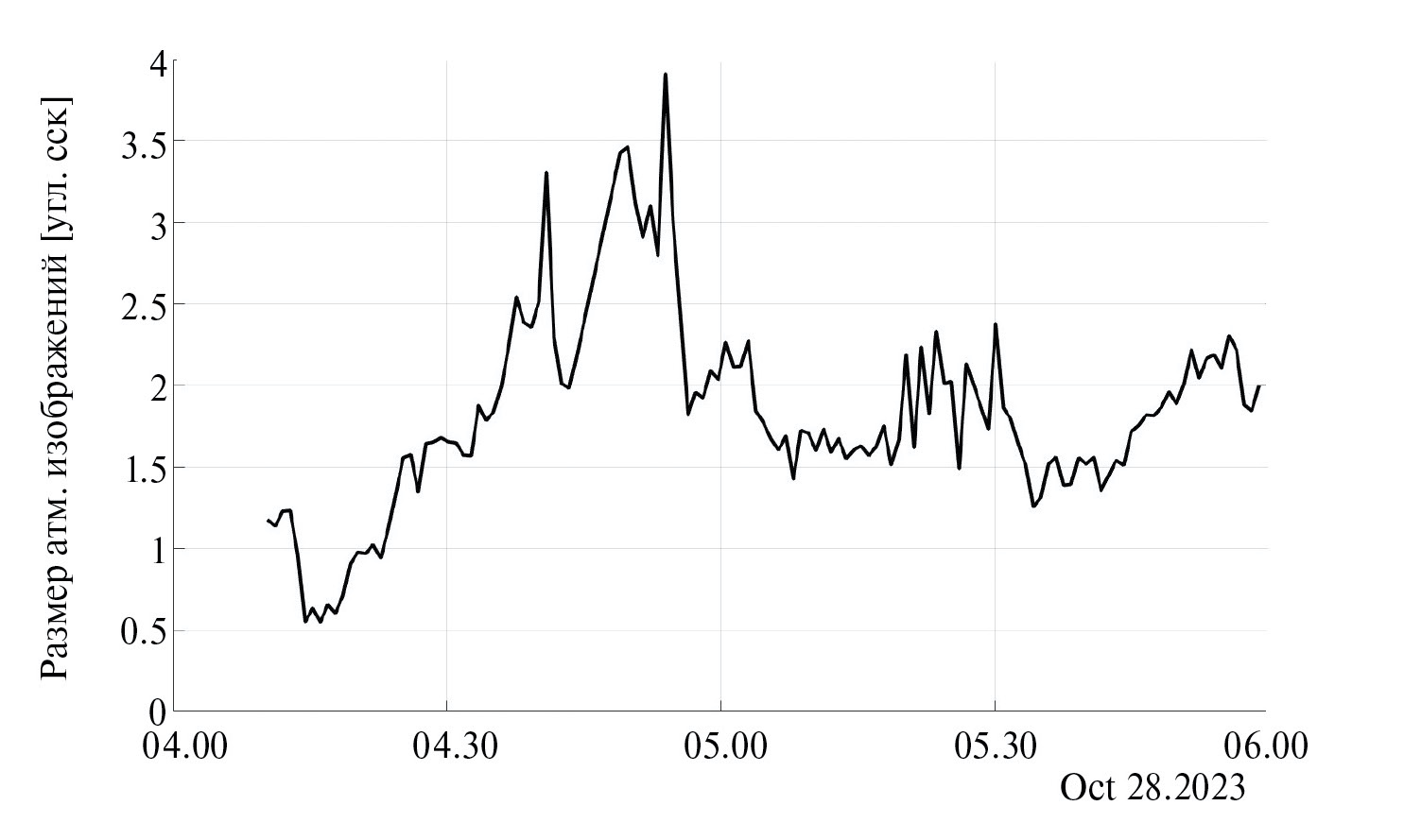 Первые измерения по оценке атмосферного качества астрономического видения при помощи мобильного датчика дифференциальных дрожаний были проведены в октябре 2023 г. Измерения проводились с высоты 1.5 метра ввиду отсутствия возможности поднять прибор выше, при температуре воздуха от −10°C до −14°C и скорости ветра 2−5 м/с. Непрерывный ряд наблюдений размеров атмосферных изображений был получен примерно с 4:10 до 6:00. На рис. 8 представлен ход атмосферного качества астрономического видения.
