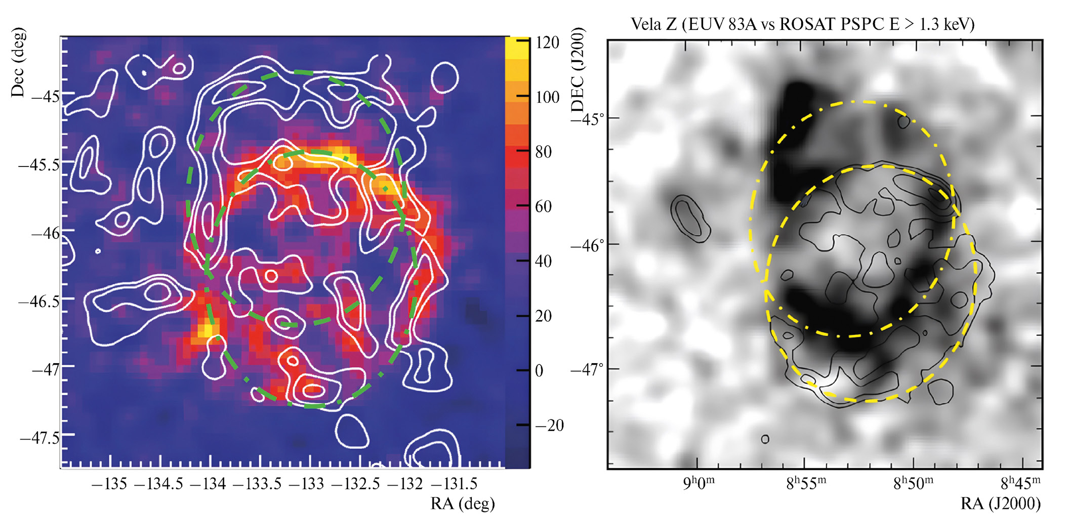 Рис. 7. Снимок остатка сверхновой RX J0852.0–4622 в различных диапазонах с двухкольцевой структурой. Слева: в гамма-диапазоне при энергиях E > 0.5 ТэВ с радио-контурами на частоте 1384 МГц (H.E.S.S., ATCA). Размерность цветовой шкалы — отсчеты. Адаптировано из [15]. Справа: в экстремальном УФ с λ = 83 Å с рентгеновскими контурами при энергиях E > 1.3 кэВ (EUVE, ROSAT PSPC). Адаптировано из [11].