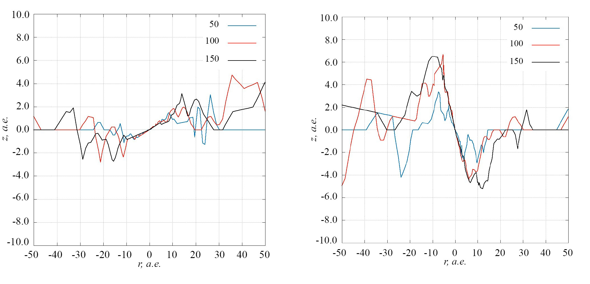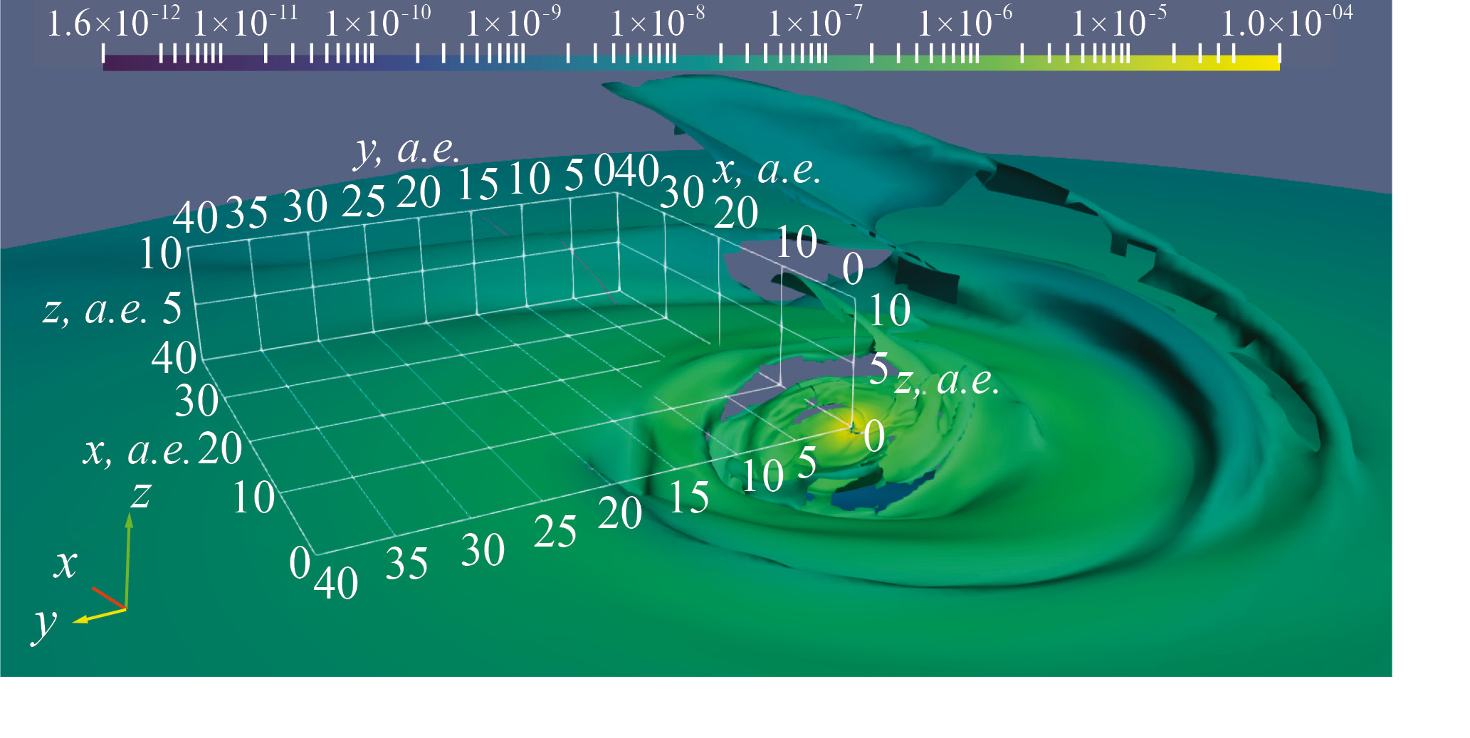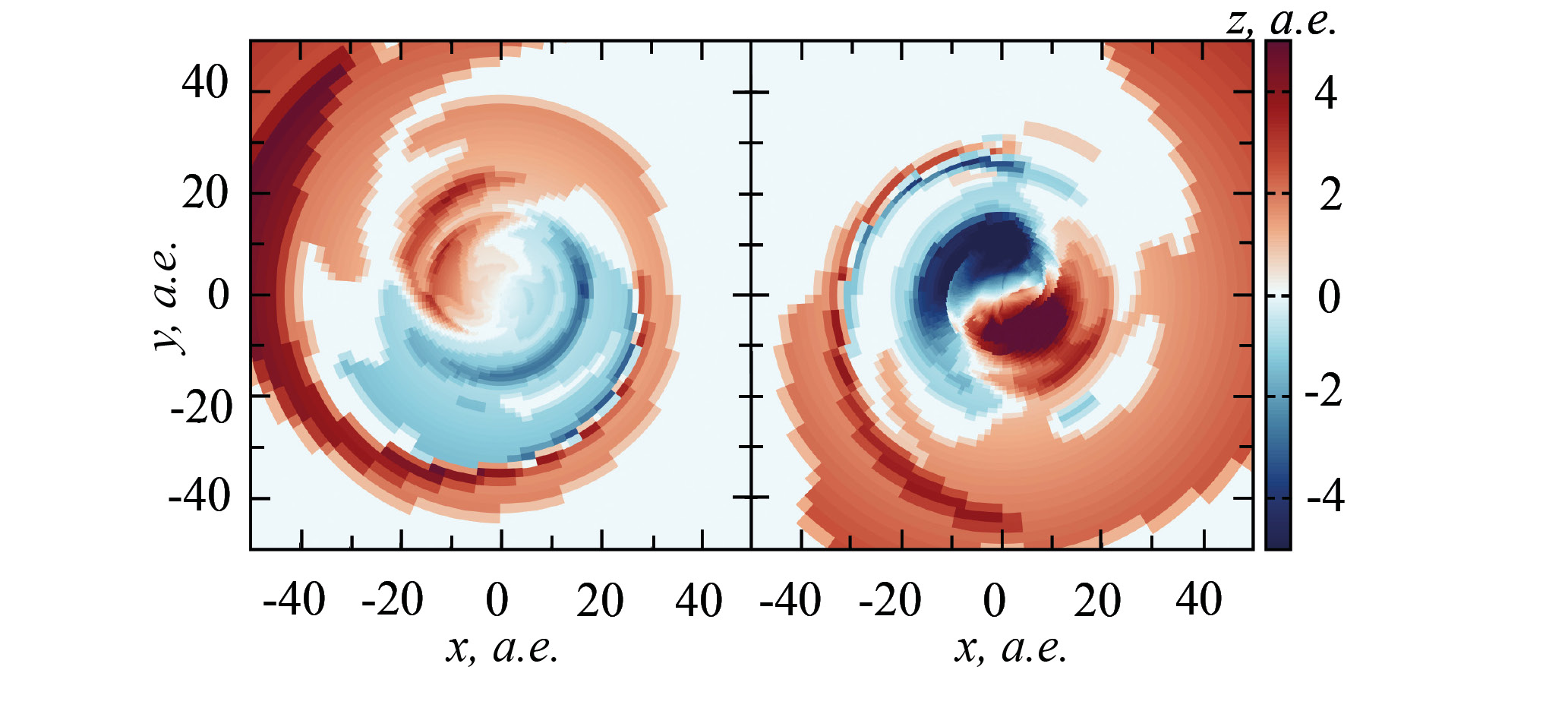 Следует отметить, что в данных расчетах не учитывался перенос излучения. Результаты расчетов показали, что после столкновения вещества струи с диском происходит нагрев газа до нескольких тысяч градусов Кельвина в области столкновения вследствие адиабатического сжатия. Затем нагретая область растягивается в спираль кеплеровским вращением диска и распространяется на периферию диска, прогревая его. К моменту времени 150 лет спиральная структура располагается в пределах радиуса 45 а. е. Таким образом, перенос тепла происходит со скоростью а. е. за лет. В работе [73] показано, что характерное время тепловой релаксации вещества диска массой под действием радиативных процессов на расстоянии 7.5 а. е. составляет года и убывает с ростом расстояния и температуры. Таким образом, диск должен эффективно охлаждаться излучением. Тогда, как было отмечено в работе [72], вспышка аккреционной активности звезды, вызванная падением сгустка на диск, также должна сопровождаться усилением инфракрасного излучения из возмущенной области диска.