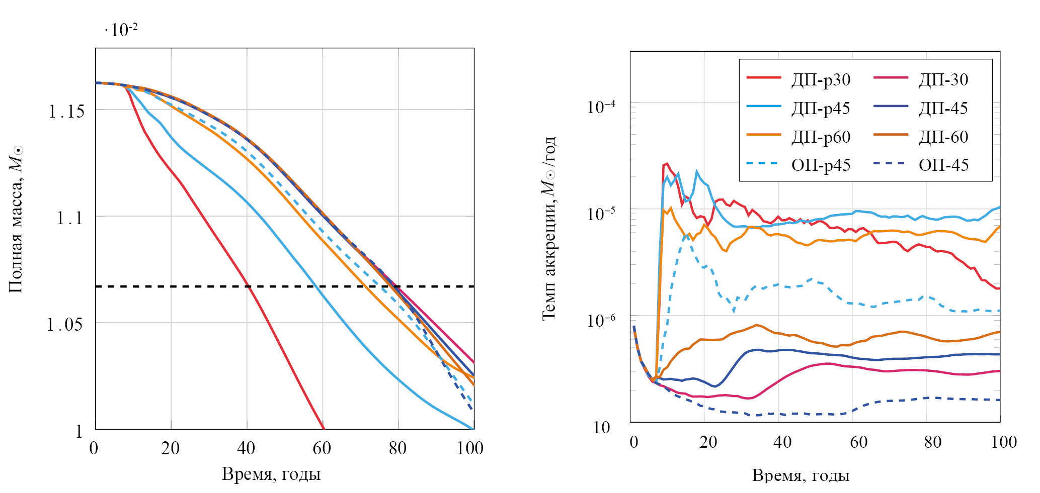 Кроме того, при ретроградном падении струи в диске образуется обширная область вещества, скорости которого составляют меньше 65% кеплеровской скорости на том же расстоянии. Такое вещество начинает ускоренно падать на звезду, тем самым темп аккреции увеличивается на два порядка, а затем происходит плавное уменьшение темпа аккреции в процессе релаксации диска. В таком случае можно ожидать FU Ori-подобную вспышку светимости. Следует отметить, что турбулентная вязкость несущественно меняется в процессе столкновения струи с веществом диска. Начальная масса сгустка, необходимая для увеличения темпа аккреции на два порядка, в данной работе в 3 раза меньше, а расстояние столкновения в 3 раза больше, чем полученное в работе [43]. Это связано с тем, что скорости вещества при столкновении с ретроградно падающей струей в рассмотренной модели распределены в диапазоне значений, который включает в себя в том числе величины, которые меньше 60% от кеплеровской скорости, а не заданы одинаковыми для всего возмущения, как в предыдущей работе.