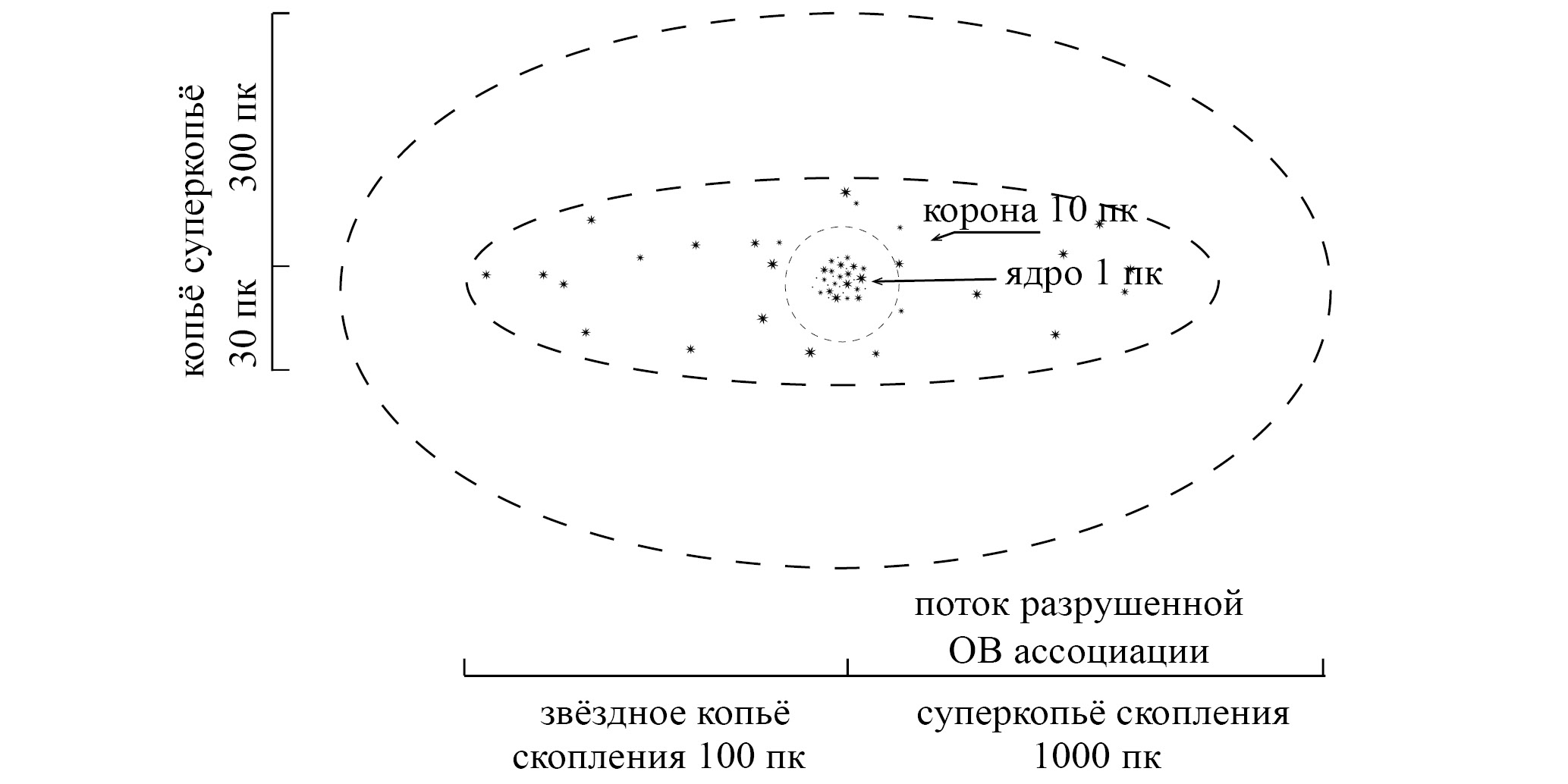 Рассмотрим структуру эволюционирующего рассеянного звездного скопления Галактики (рис. 1). Характерная масса молодого скопления ~ 102M⊙ радиус ядра ~ 0.3 пк [65, 66]. В ходе начальной стадии коллапса ГМО и в процессе динамической эволюции ядра скопления под влиянием парных взаимодействий звезд ядра в пределах полости Роша (поверхность Хилла) скопления образуется и поддерживается звездная корона ядра с радиусом R, определяемым массой скопления m и расстоянием до центра Галактики Rc: , где MG масса Галактики, (4). В солнечных окрестностях радиус короны скопления с массой ~102M⊙ составляет ~ 4 пс. В ходе начального коллапса ГМО и формирования скопления часть звезд приобретают гиперболические скорости [15] и теряется скоплением.