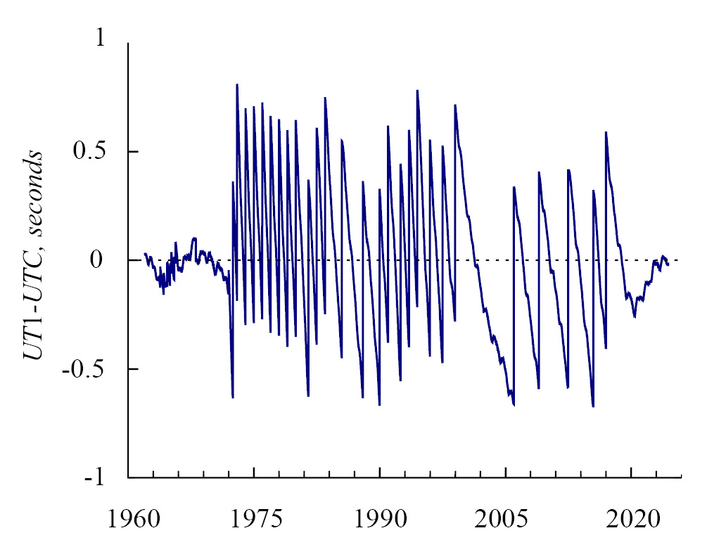 Разность между астрономической шкалой всемирного времени UT1 и атомной шкалой времени TAI, обычно обозначаемая как TAI–UT1, монотонно росла с 1961 г. (когда была введена шкала UTC) до начала 2020-х гг. (не считая небольших декадных и сезонных вариаций), после чего стало наблюдаться аномальное ускорение вращения Земли, что выразилось в тенденции к уменьшению TAI–UT1 в последние годы (см. рис. 2 ниже).