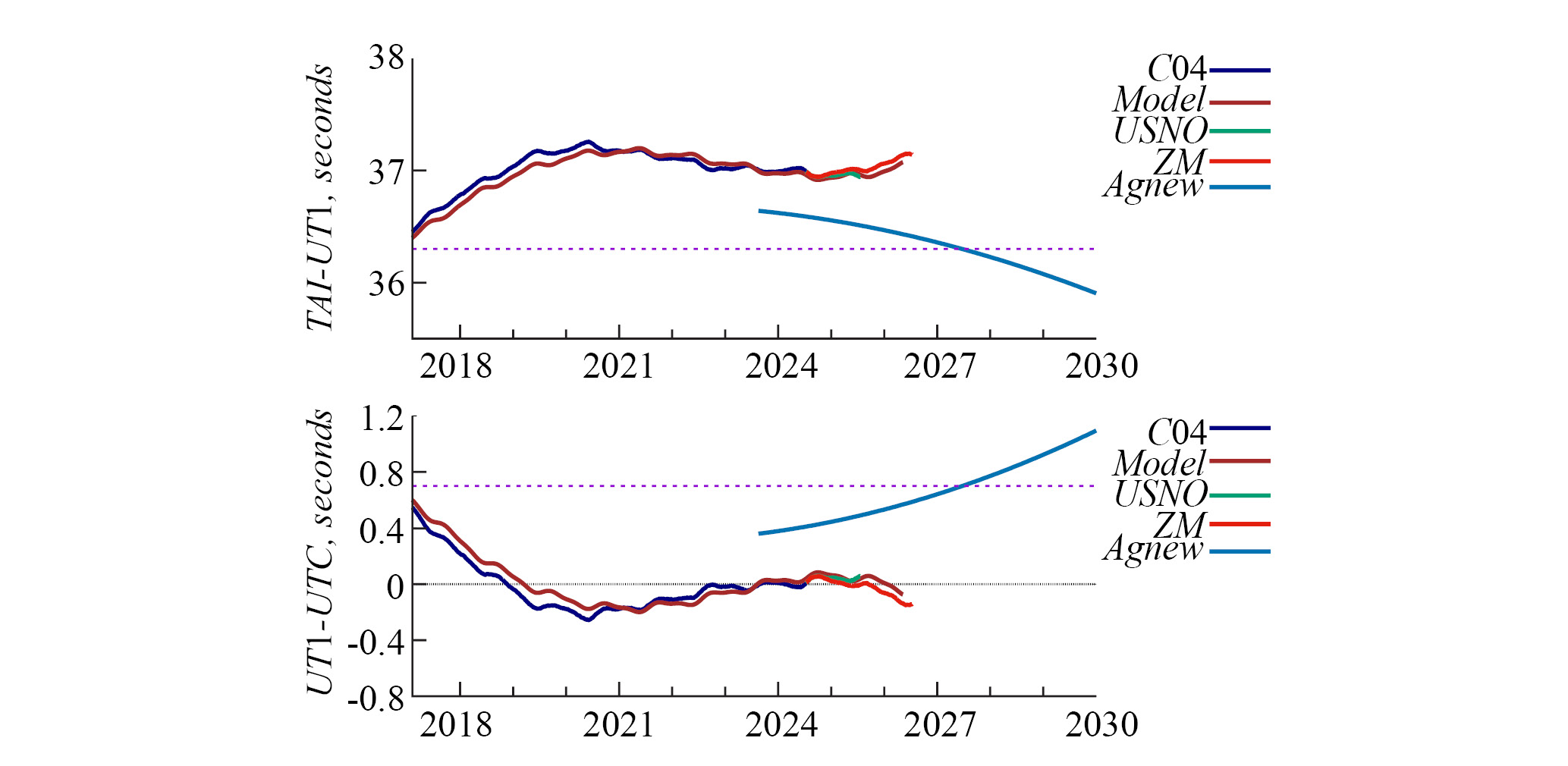 Несколько последних прогнозов всемирного времени, представленные на рис. 3, не предсказывают существенного уменьшения разности TAI–UT1 во второй половине 2020-х гг., а скорее показывают намечающуюся тенденцию к переходу к стадии ее роста. Таким образом, результаты, полученные в настоящей работе, являются существенным уточнением результата [7] в свете последних наблюдательных данных.