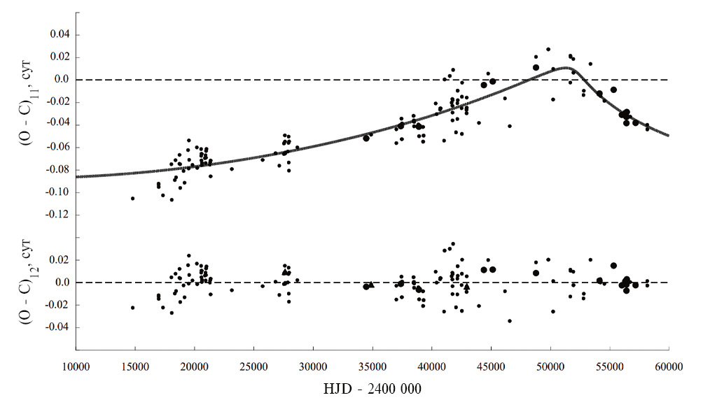 На рис. 2 приведены разности (O – C)11 между наблюдаемыми моментами минимумов δ Lib и вычисленными с линейными элементами (2). Сплошной линией показана теоретическая кривая для светового уравнения с параметрами из табл. 1. В нижней части рисунка приведены значения (О – С)12 , полученные вычитанием из (О – С)11 теоретической кривой для светового уравнения.