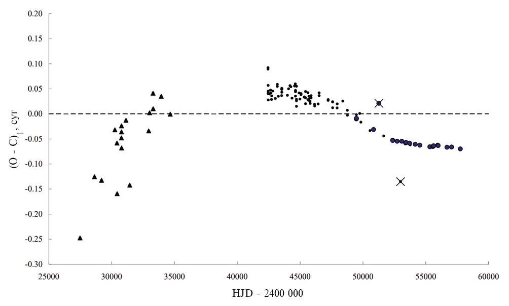 На рис. 5 приведены разности (O – C)1 между наблюдаемыми (О) моментами минимумов SX Lyn и вычисленными (C) с линейными элементами, полученными методом наименьших квадратов с использованием всех имеющихся моментов главного минимума: