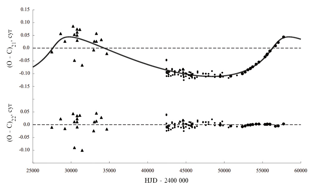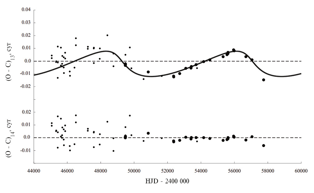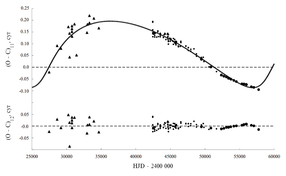 Используя значения масс компонентов затменно-двойной системы из [7]: М1 = 3.60 Mʘ, М2 = 1.50 Mʘ, получаем М3 sin i3 = 0.875 Mʘ. Считая третий компонент звездой Главной последовательности, из соотношения масса-светимость в соответствующем диапазоне масс [17] найдем светимость третьего тела: L3 = 0.493 Lʘ и третий свет в блеске системы l3 = 0.003, то есть слишком мал для обнаружения. В этом случае можно предположить присутствие дополнительного тела в системе. В то же время колебания вследствие магнитной активности маловероятны из-за большого периода и большого эксцентриситета.