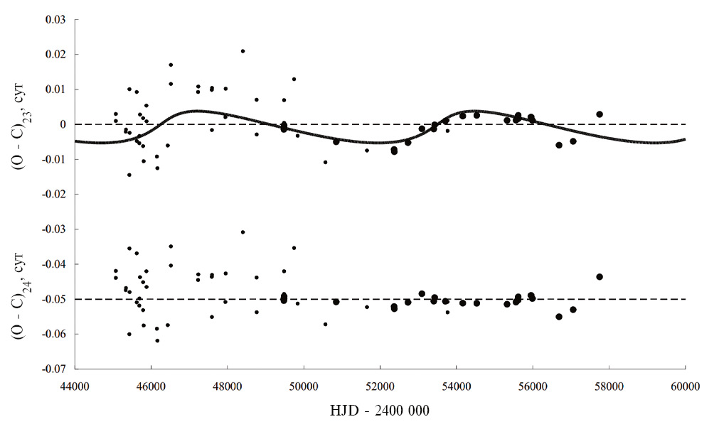 Сначала предполагаем, что циклические изменения периода можно описать световыми уравнениями вследствие присутствия в системе дополнительных тел. Для меньшего периода функция масс равна 0.0019 Мʘ и минимальная масса третьего тела 0.26 Мʘ. Для бо́льшего периода функция масс равна 0.635 Мʘ и минимальная масса 2.69 Мʘ. Если же предположить четырехкратную систему, минимальная масса более удаленного тела получается равной 2.81 Мʘ. Здесь также только колебания периода с меньшим периодом могут быть следствием присутствия в системе дополнительного тела. Для предполагаемого дополнительного тела с бо́льшим периодом масса получается меньше, чем в предыдущем случае, но все же довольно велика.