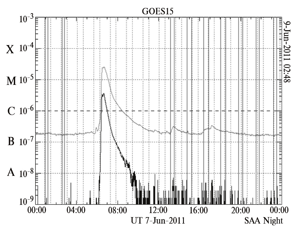 Рис. 1. Поток рентгеновского излучения GOES15 [вт/м2 ]. Серая кривая соответствует диапазону 1–8 Å, черная кривая — диапазону 0.5–4 Å.
