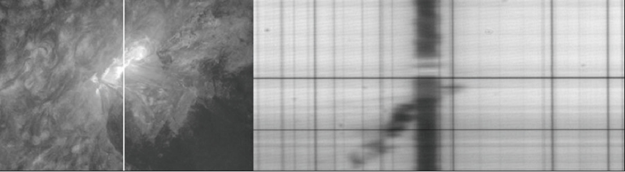 Рис. 2. Слева — SDO фильтрограмма в линии 304 Å. Белая вертикальная линия соответствует положению щели спектрографа. Справа — спектр Hα (MFS Ondřejov). Момент наблюдений: 06:40:32 UT.