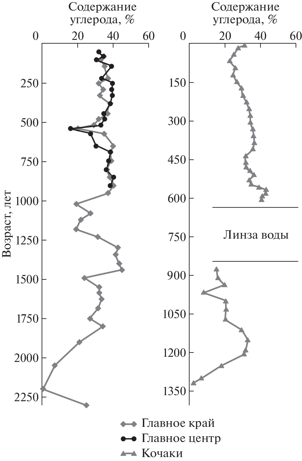 The purpose of this work is to identify the features of development and to estimate the intensity of carbon accumulation in the peat deposits of the floating mires of the Middle Russian Upland. The objects of the study were the mires Glavnoe and Kochaki-1, located in the north-eastern part of the Middle Russian Upland. To identify the genesis of the mires, the peat deposits were drilled and the botanical composition of peat was studied. The carbon content (%) was determined in peat samples and the rate of carbon accumulation by mire paleocenoses was calculated.