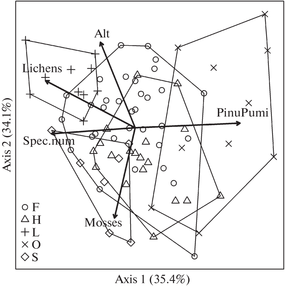 A detailed geobotanical characteristic of Siberian dwarf-pine (Pinus pumila (Pall.) Regel) communities of the north of the Koryak District is presented. The vegetation classification based on 83 relevés has been elaborated using main principles and classification methods of Russian dominant-determinant approach. As the result 10 associations, 10 subassociations and 9 variants classified within 5 association groups were revealed. The peculiarities of their species composition, community structure, ecology and geographical distribution were characterized. Using soil characteristics, several types of sites were recognized. It was shown that mesophytic moss-rich dwarf-pine shrubs (Pinetum pumilae hylocomiosum) were closely connected to the mean values of soil moisture and soil fertility of the sites. Rhododendron-rich dwarf-pine communities (subass. Pinetum pumilae rhododendroso aurei–hylocomiosum) adjoined them but they usually occurred on higher altitudes. Lichen-rich dwarf-pine shrubs (Pinetum pumilae fruticuloso–cladinosum) occupied the driest and poorest sites at the upper border of dwarf-shrub altitudinal belt (350–400 m a.s.l.). The dwarf-shrub-rich Siberian dwarf-pine communities (ass. group Pineta pumilae fruticulosa) were closely connected to rather dry and poor sites. In wet sites with shallow groundwater, Sphagnum-rich dwarf-pine communities (Pinetum pumilae sphagnosum girgensohnii) were found. Cloudberry-rich dwarf-pine shrubs (subass. Pinetum pumilae chamaemori–rubosum) adjoined them but mainly occurred on the peat hillock of palsas. The variation in the species composition and structure of communities are determined by their position in the relief and the density of the dwarf-pine layer. With a similar density of dwarf-pine, Sphagnum-rich dwarf-pine communities form in the foothills, and lichen-rich dwarf-pine shrubs form in mountains. The species diversity and the abundance of the subordinate layers are significantly reduced at the maximum density of the dwarf-pine; so poor-herb dwarf-pine communities (Pineta pumilae oligoherbosa) are formed.