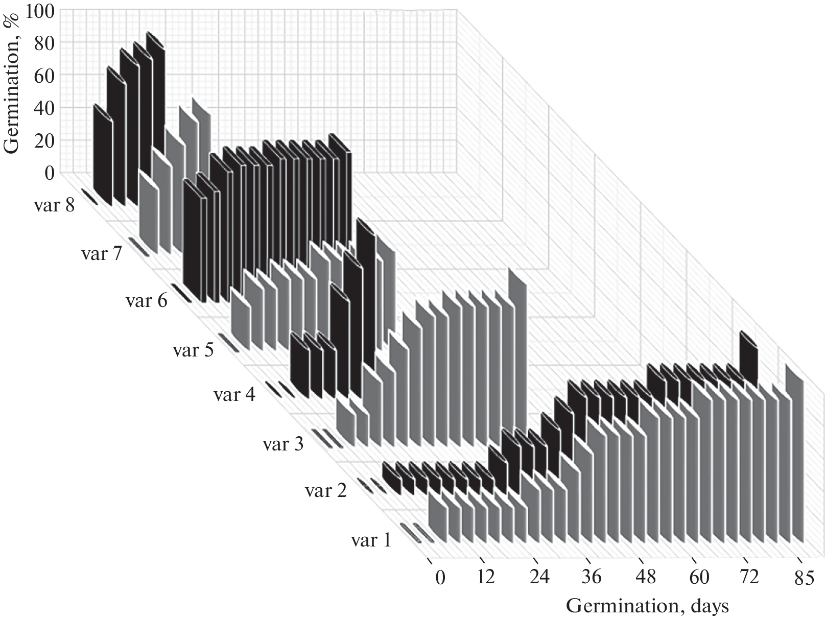 Differences in the duration and period of exposure to cold, however, did not affect the final percentage of germinated seeds. In almost all variants, the final percentage of germination was high (from 86 to 100%).