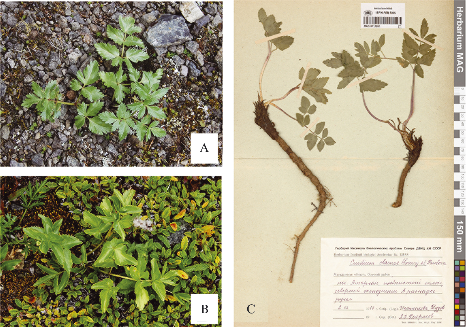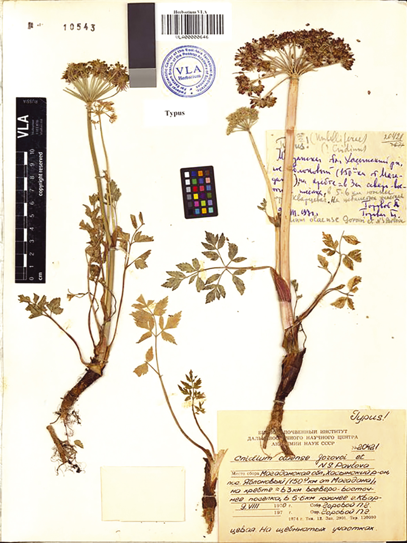 Тип во Владивостоке: Магаданская обл., Хасынский р-н, пос. Яблоневый (150 км от Магадана), на хребте приблизительно в 3 км северо-восточнее поселка, в 5–6 км южнее г. Кварцевая, на щебнистых участках, 10 VIII 1970, П.Г. Горовой, Т.П. Горовая (VLA00000678, рис. 1). Отметим, что в первоописании C. olaense (Gorovoy, Pavlova, 1972) не полностью процитирована этикетка: «Тип: Магаданская обл., Хасынский р-н, пос. “150-й км” на трассе Магадан – Ягодное, у вершины хребта в 5–6 км южнее горы Кварцевая, на щебнистых участках, 10 VIII 1970. цв. и пл. П.Г. Горовой и Т.П. Горовая». Там же приведены два паратипа: “Магаданская обл., 150-й км от Магадана по трассе к пос. Ягодное, у вершины хребта, 6 VIII 1969, Н.С. Павлова. Магаданская обл., Ольское плато, в 180 км севернее Магадана, 5 IX 1970, Б.А. Юрцев и А.П. Хохряков. В Москве, ГБС”. Позднее (Pimenov, Lavrova, 1985) при описании нового рода Мagadania были перечислены 12 исследованных образцов (specimena examinata), которые были изучены во VLA, MW, MAG. В монографии “Зонтичные России” (Pimenov, Ostroumova, 2012) ошибочно, хотя и с вопросом, указано, что голотип хранится в MHA.