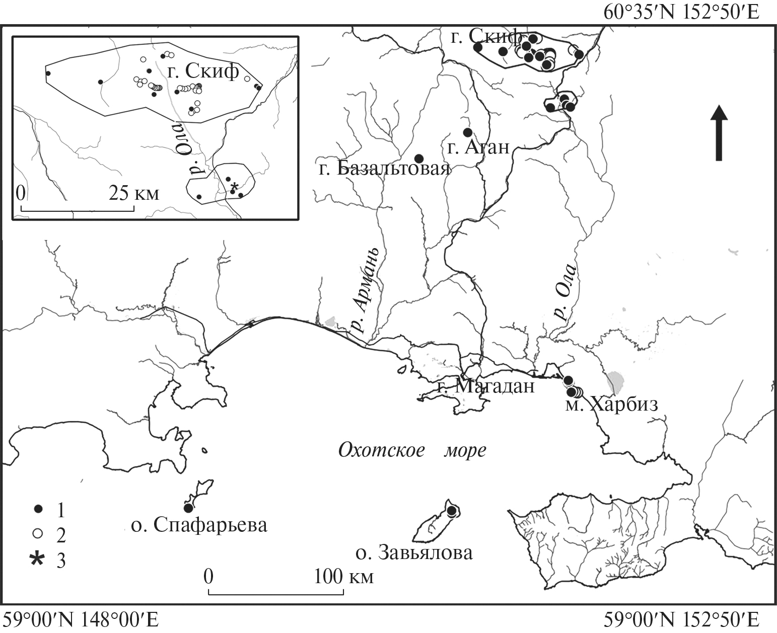 Рис. 2. Ареал Magadania olaënsis в Магаданской области. На врезке – фрагмент ареала на Ольском плато на Охотско-Колымском водоразделе.