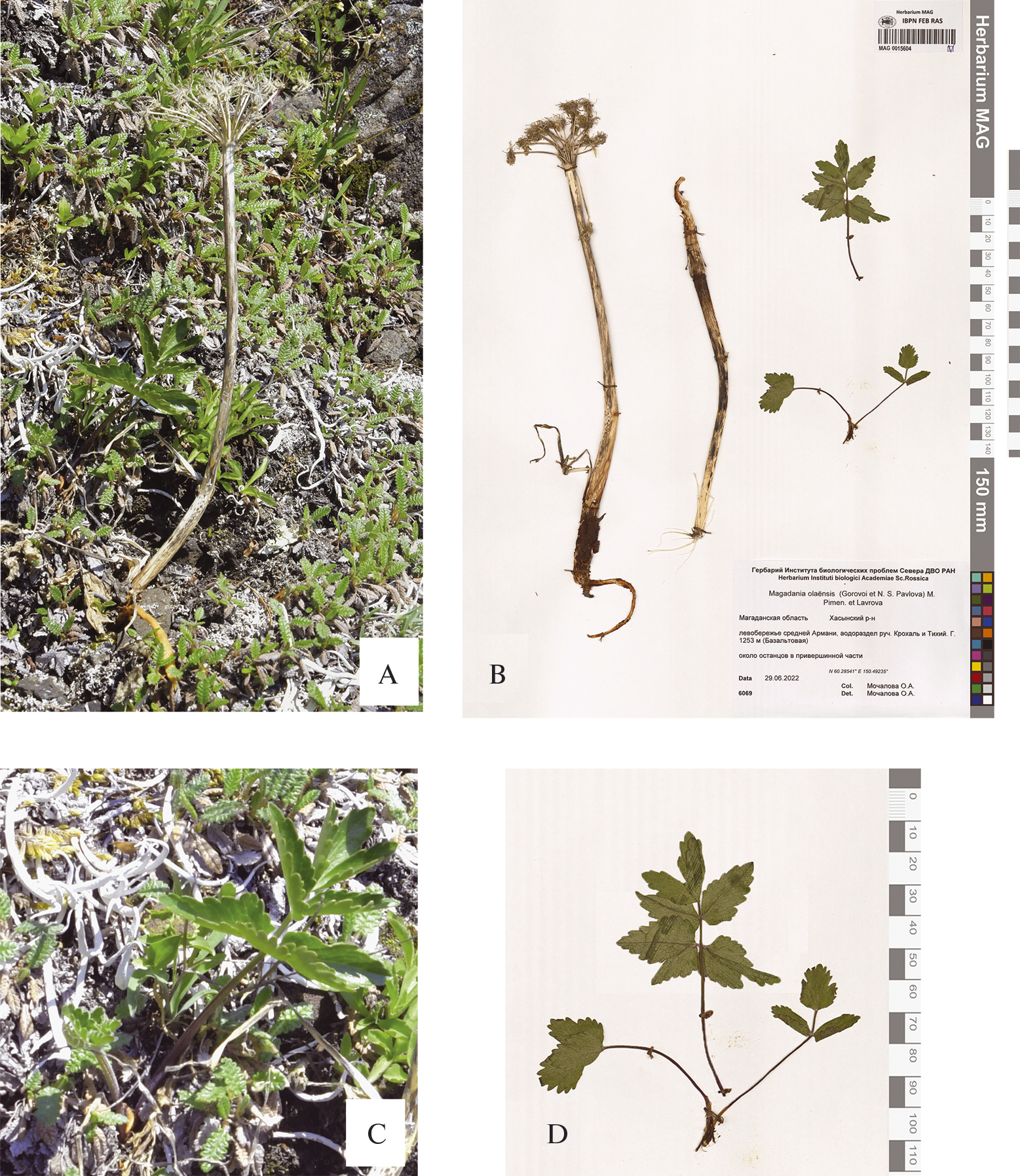 Рис. 3. Прошлогодний стебель (А, B) и двулетнее растение (C, D) Magadania olaënsis в природной обстановке (А, С) и в гербарии (В, D) (29 июня 2022, MAG0015604).