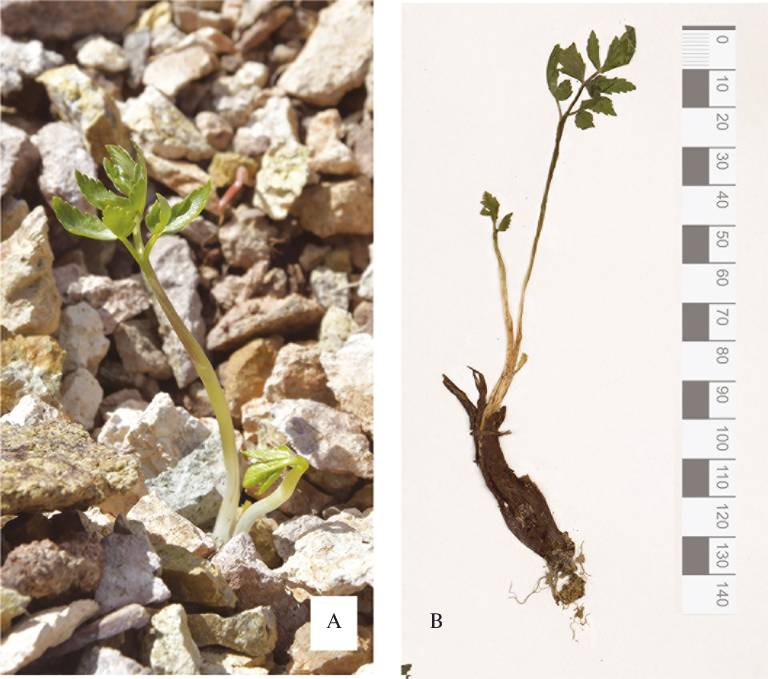 Fig. 4. Virginal 3(4)-year-old plant of Magadania olaënsis in naturе (A) and in herbarium (B) (June 18, 2021, MAG0011715).