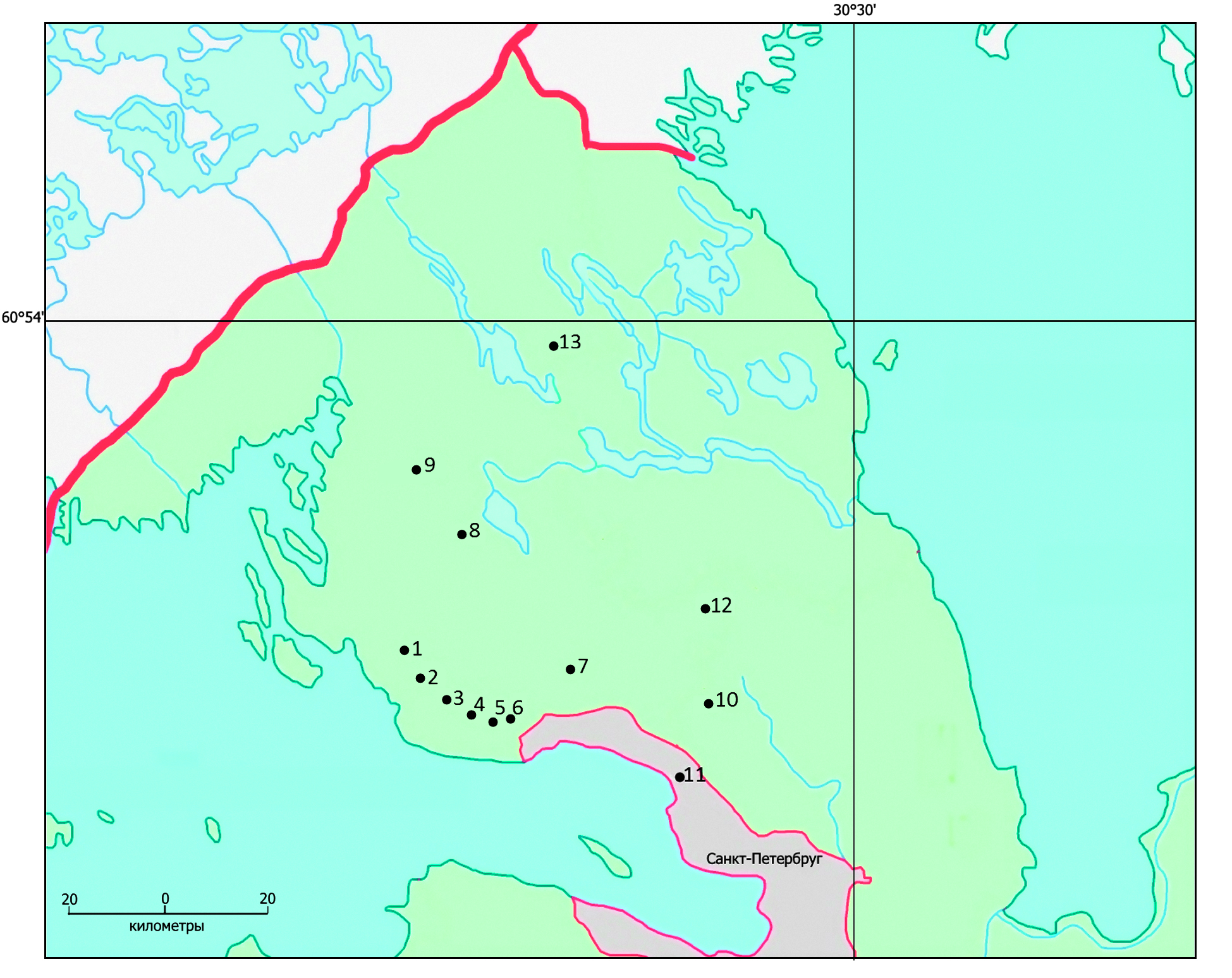 1 – Bol’shiye Kamyshi; 2 – Udel’noye; 3 – Duplyanskoye; 4 – Lesoostrovskoye; 5 – Maloye Znamenskoye; 6 – Bol’shoye Znamenskoye; 7 – Mukhinskoye; 8 – Oblozhnyy Mokh; 9 – Cherkasovskoye; 10 – Harvazi; 11 – Sestroretskoye; 12 – Ostrovskoye; 13 – Nizovskoye.