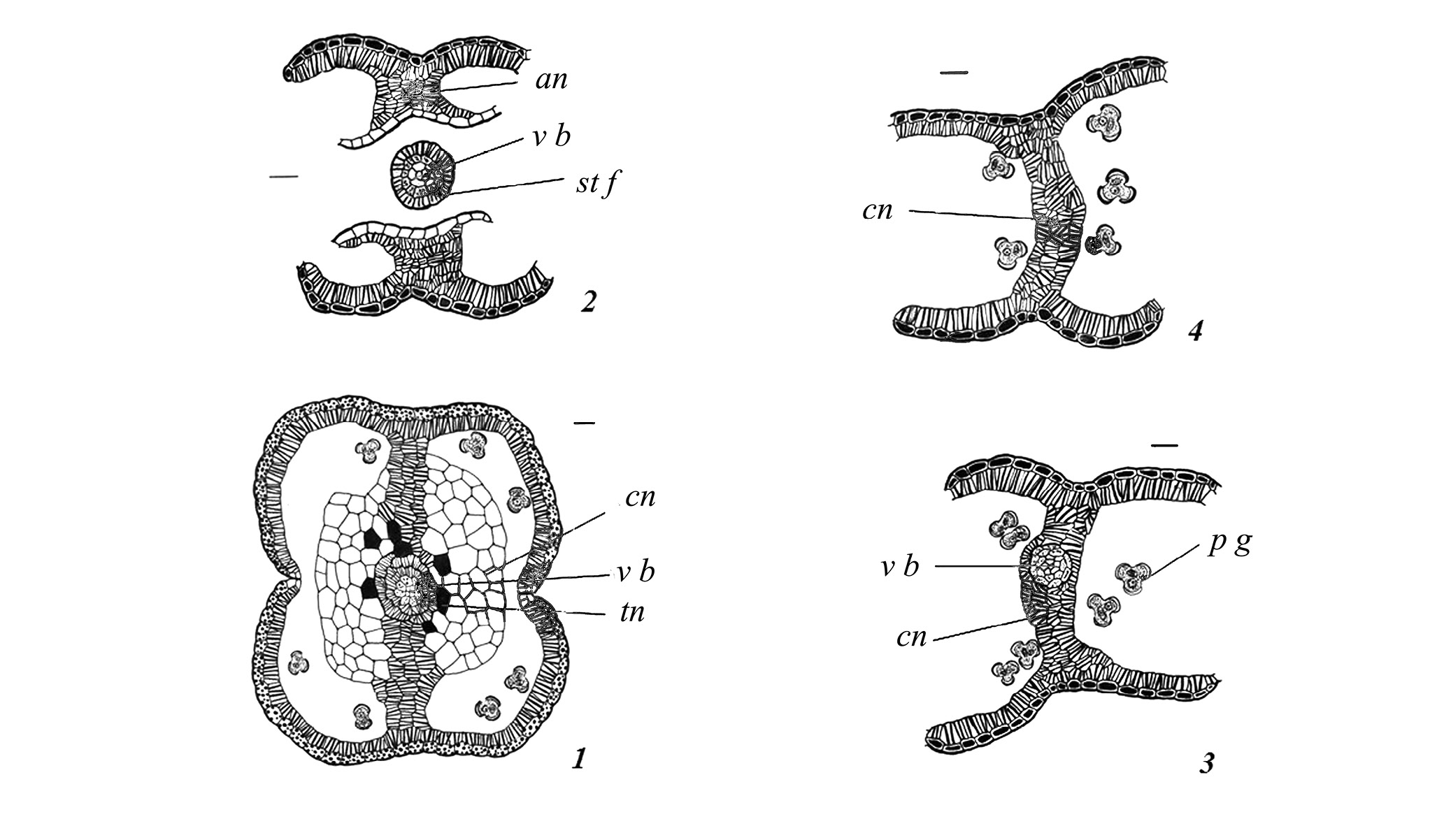 1–3 – строение пыльника: перед вскрыванием в средней области, сросшейся с тычиночной нитью (1), во вскрывшемся пыльнике – в свободной от тычиночной нити базальной части (2), в средней (3) и верхней (4) частях; в эндотеции и большинстве клеток пыльника формируются фиброзные утолщения, в клетках эпидермы и вокруг проводящего пучка выявляются танины; an – танины, cn – связник, p g – пыльцевое зерно, st f – тычиночная нить, tn – танины, v b – проводящий пучок. Масштабная линейка, мкм: 10.