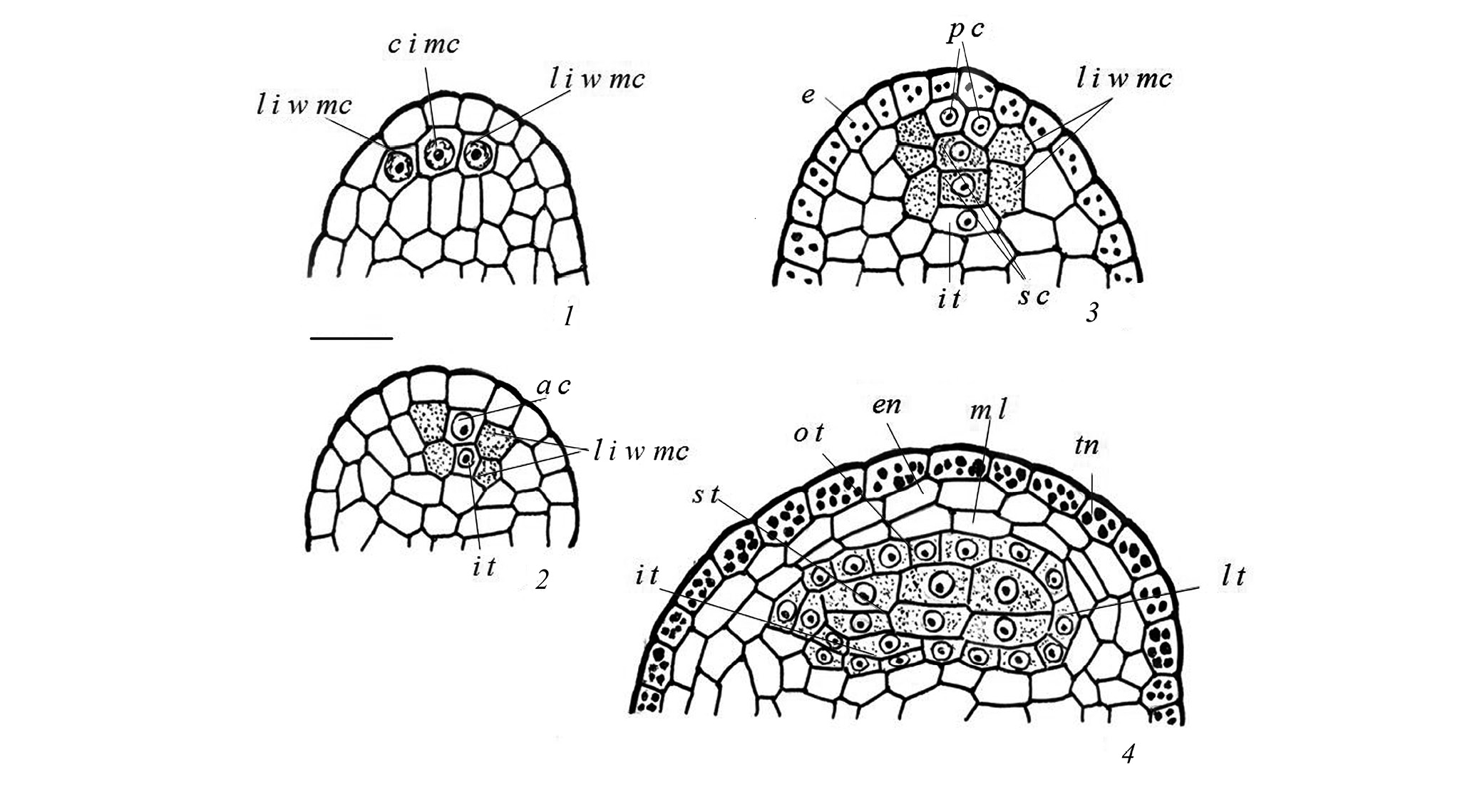 Рис. 3. Ранние стадии развития пыльника у Monanthes anagensis (поперечные срезы): 1, 2 – бугорок пыльника, деления инициалей микроспорангия, формирование клеток внутреннего тапетума, археспория и инициалей латеральных частей стенки; 3 – в результате деления археспориальной клетки образуются спорогенная (внутрь) и париетальная (наружу) клетки и затем благодаря формирующим делениям происходит увеличение их числа; 4 – образование слоя наружного тапетума и деления клеток наружного париетального слоя на эндотеций и средний слой, в клетках эпидермы выявляются танины; a c – археспориальная клетка, c i mc – центральная инициаль микроспорангия, e – эпидерма, en – эндотеций, i t – внутренний тапетум, l i w mc – инициали латеральной части стенки микроспорангия, l t – латеральный тапетум, m l – средний слой, o p l – наружный париетальный слой, o t – наружный тапетум, p c – париетальная клетка, s c – спорогенная клетка, s t – спорогенная ткань, tn – танины. Масштабная линейка, мкм: 10.